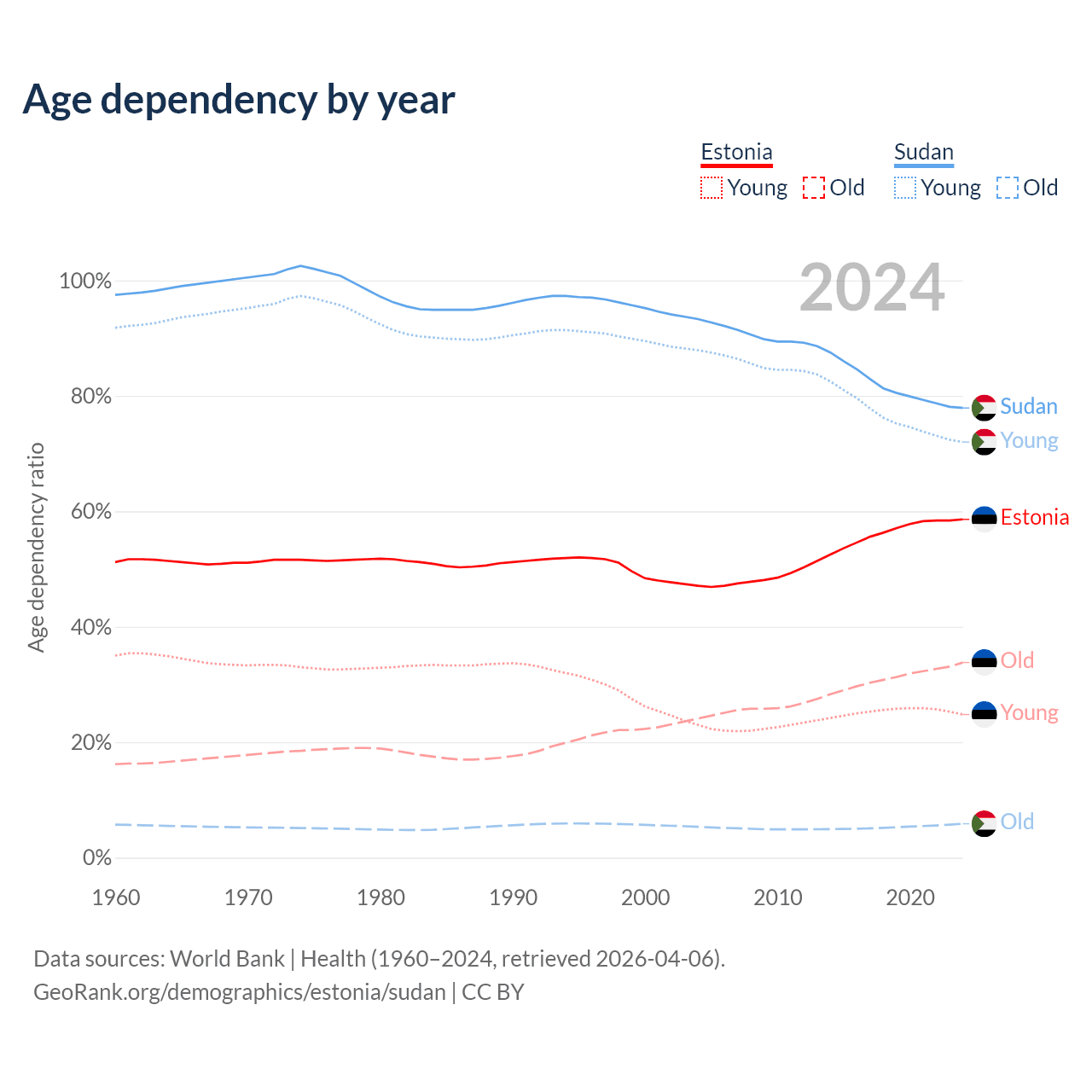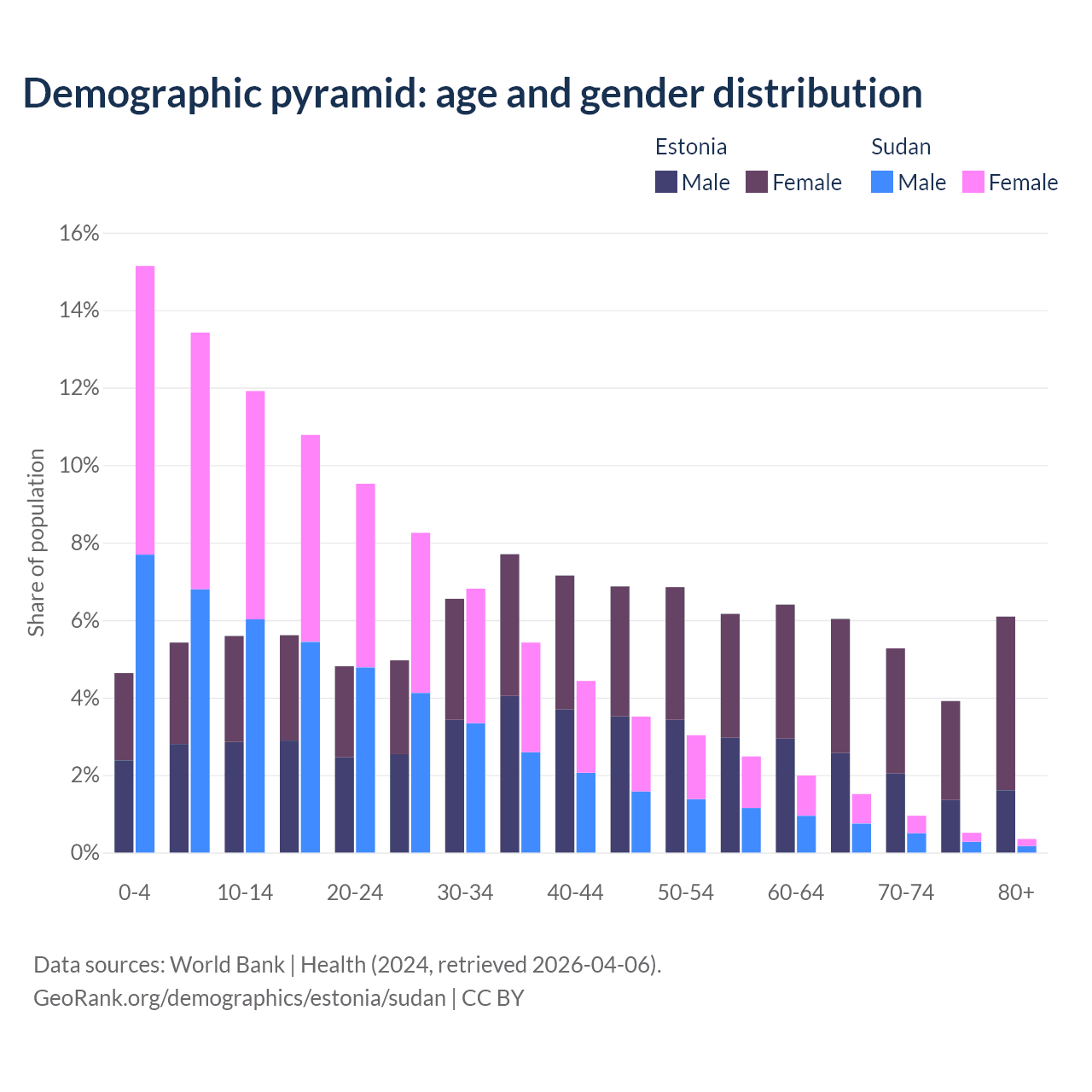- Estonia is ranked 25/196 by median age (oldest to youngest) vs 172/196 for Sudan.