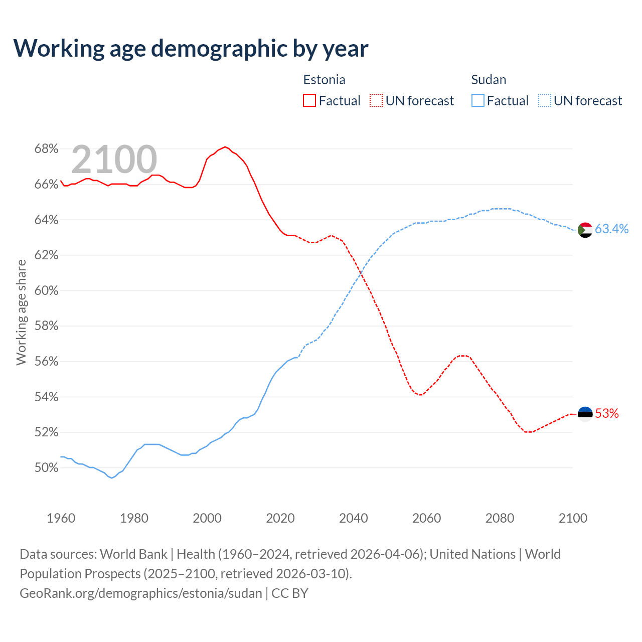 - Estonia has 845K working age adults (aged 15-64) vs 30M in Sudan.
