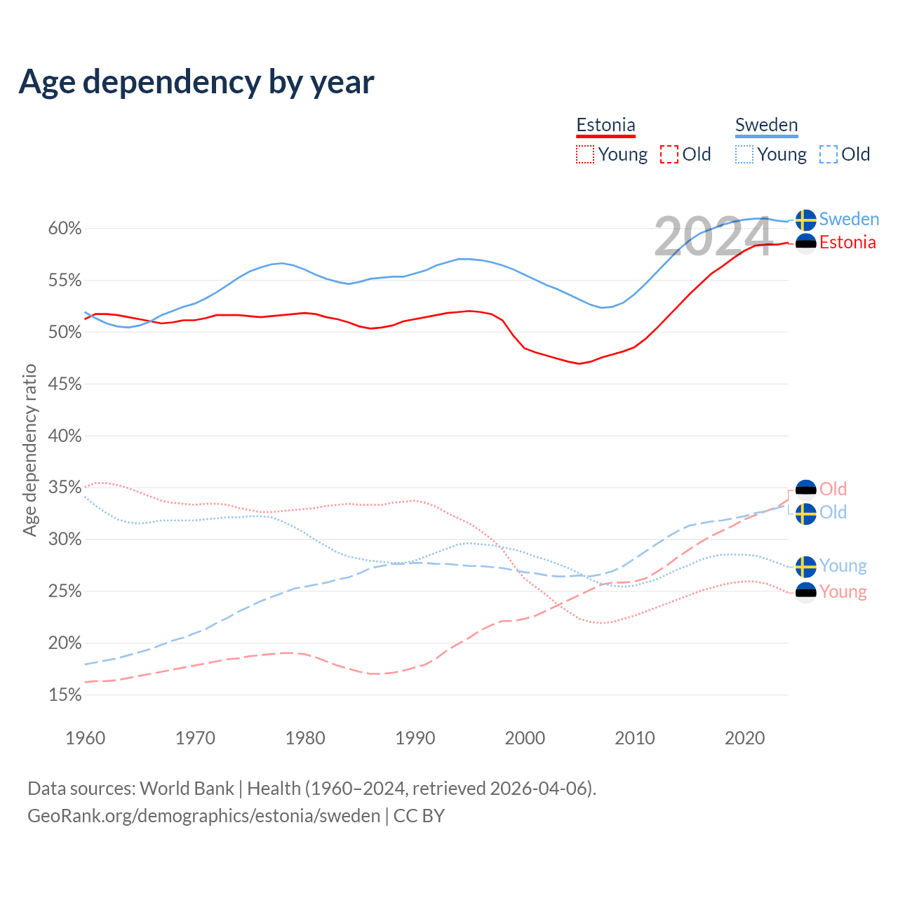 - Estonia is ranked 25/196 by median age (oldest to youngest) vs 39/196 for Sweden.