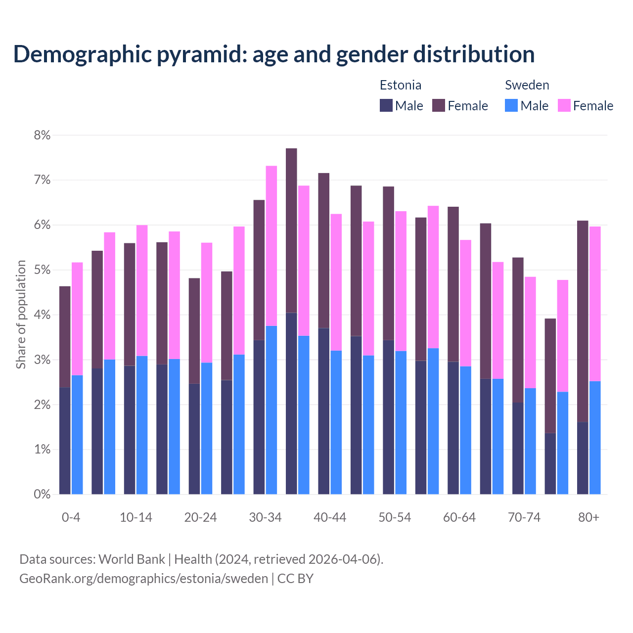 - As of 2026, the population of Estonia is 1.34M vs 10.7M in Sweden - 7.97 times difference.
