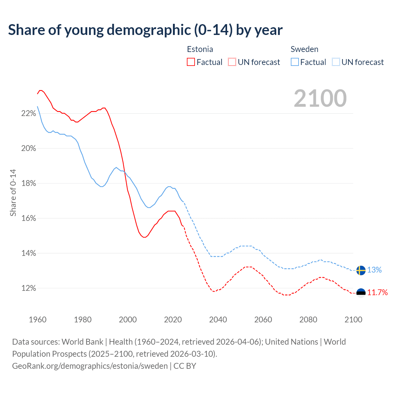 - The share of young demographic (0-15 years old) in Estonia is 15.6% vs 17% in Sweden.