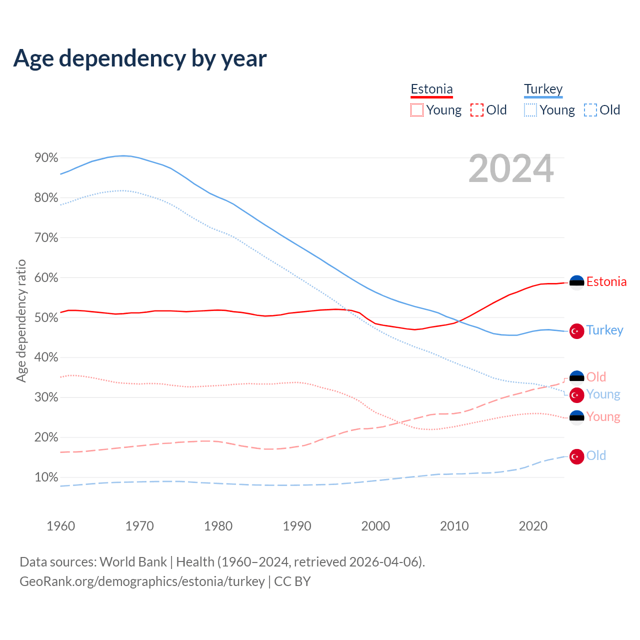Data sources: World Bank | Health (1960–2024, retrieved 2026-04-06); U.S. Census Bureau (1960–2024, retrieved 2026-02-08).
