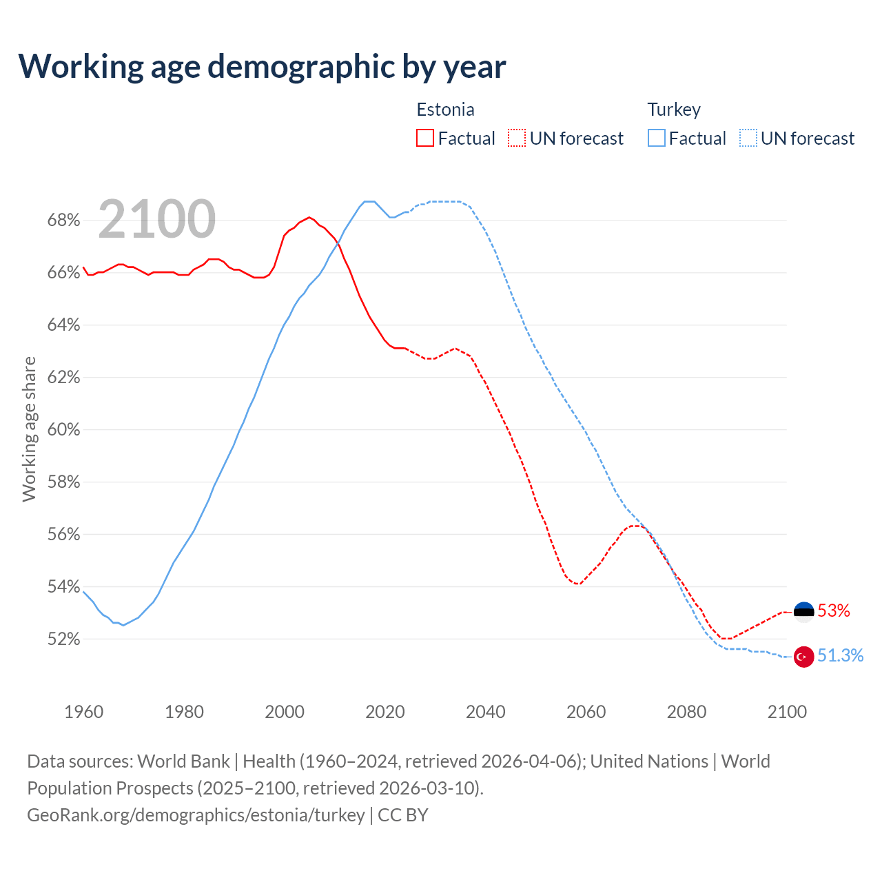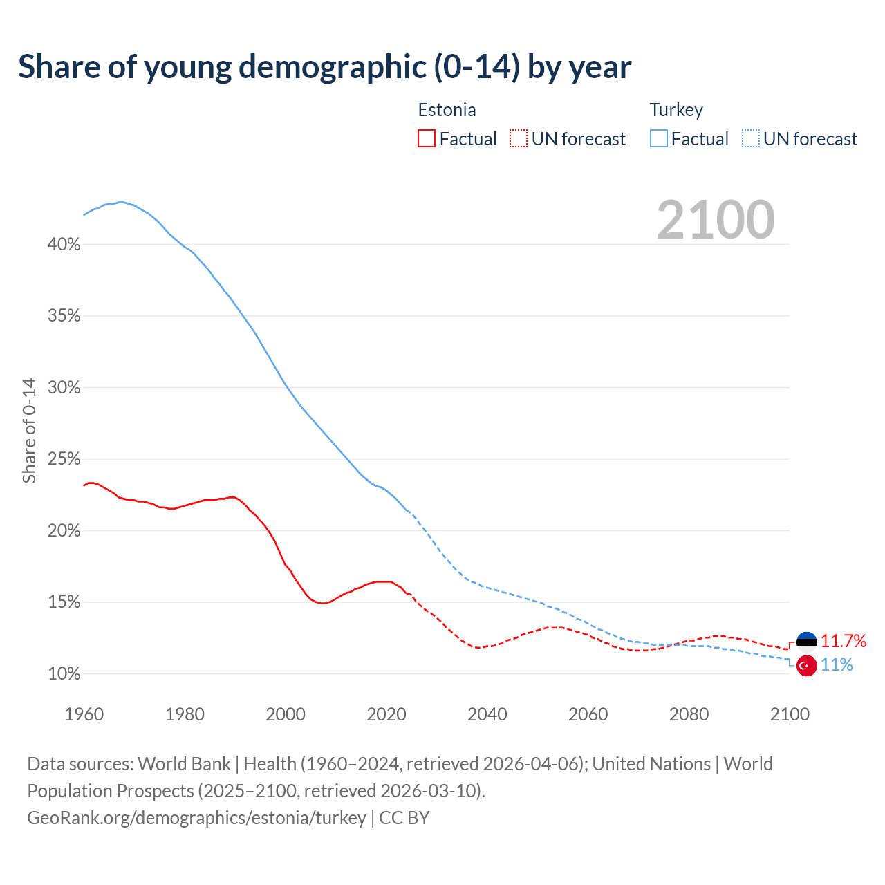 Median age Estonia vs Turkey, 1960-2100