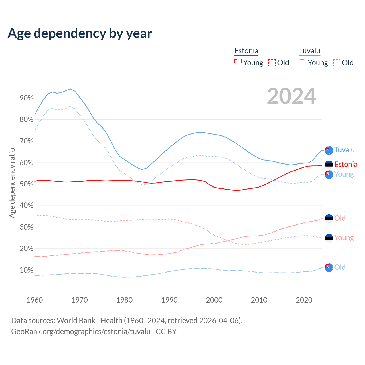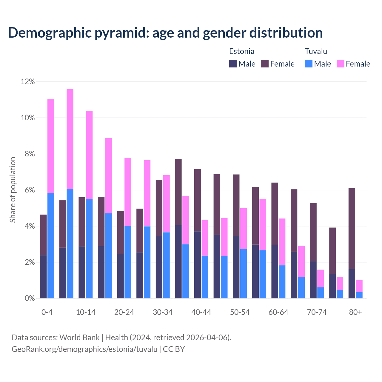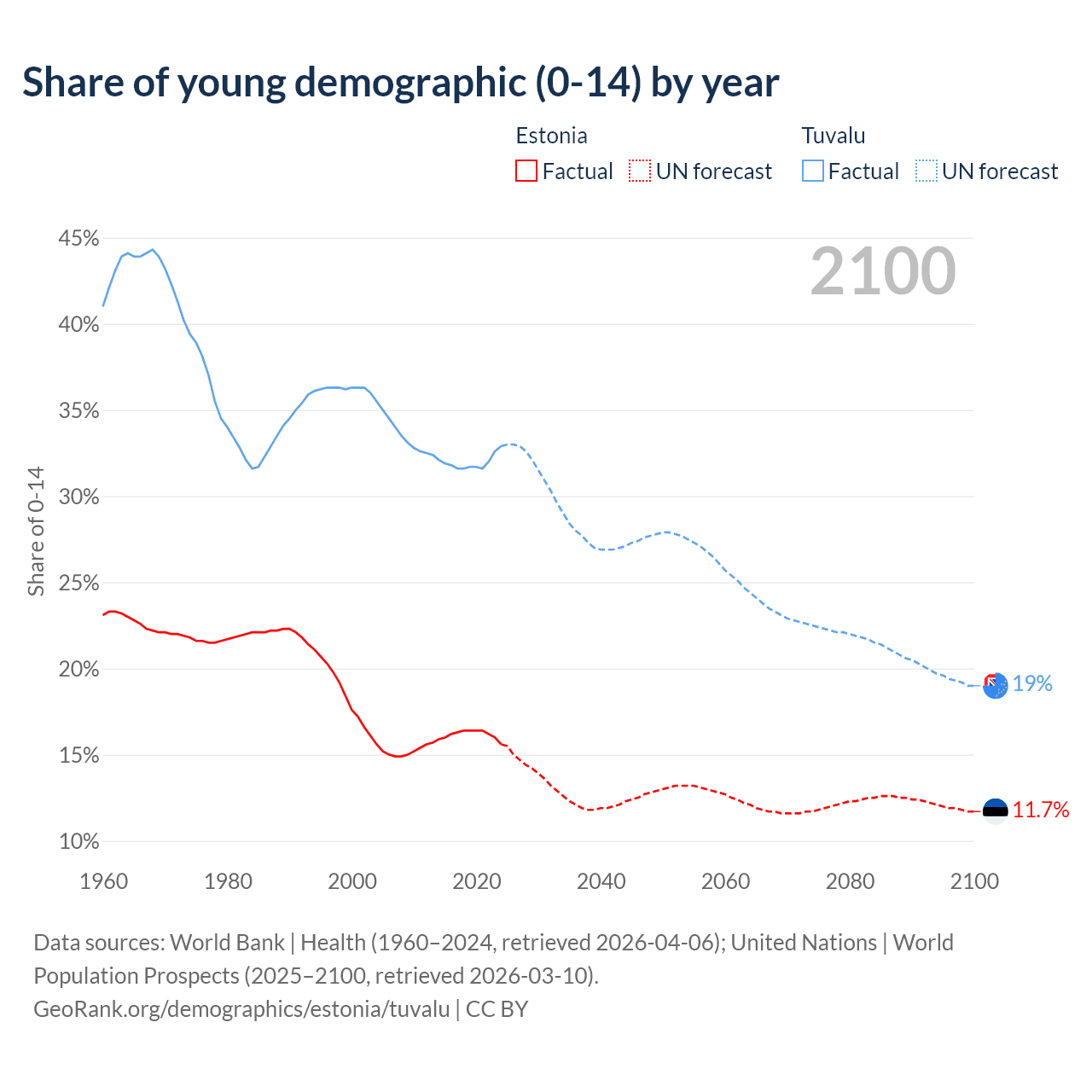 - The share of young demographic (0-15 years old) in Estonia is 15.6% vs 32.9% in Tuvalu.