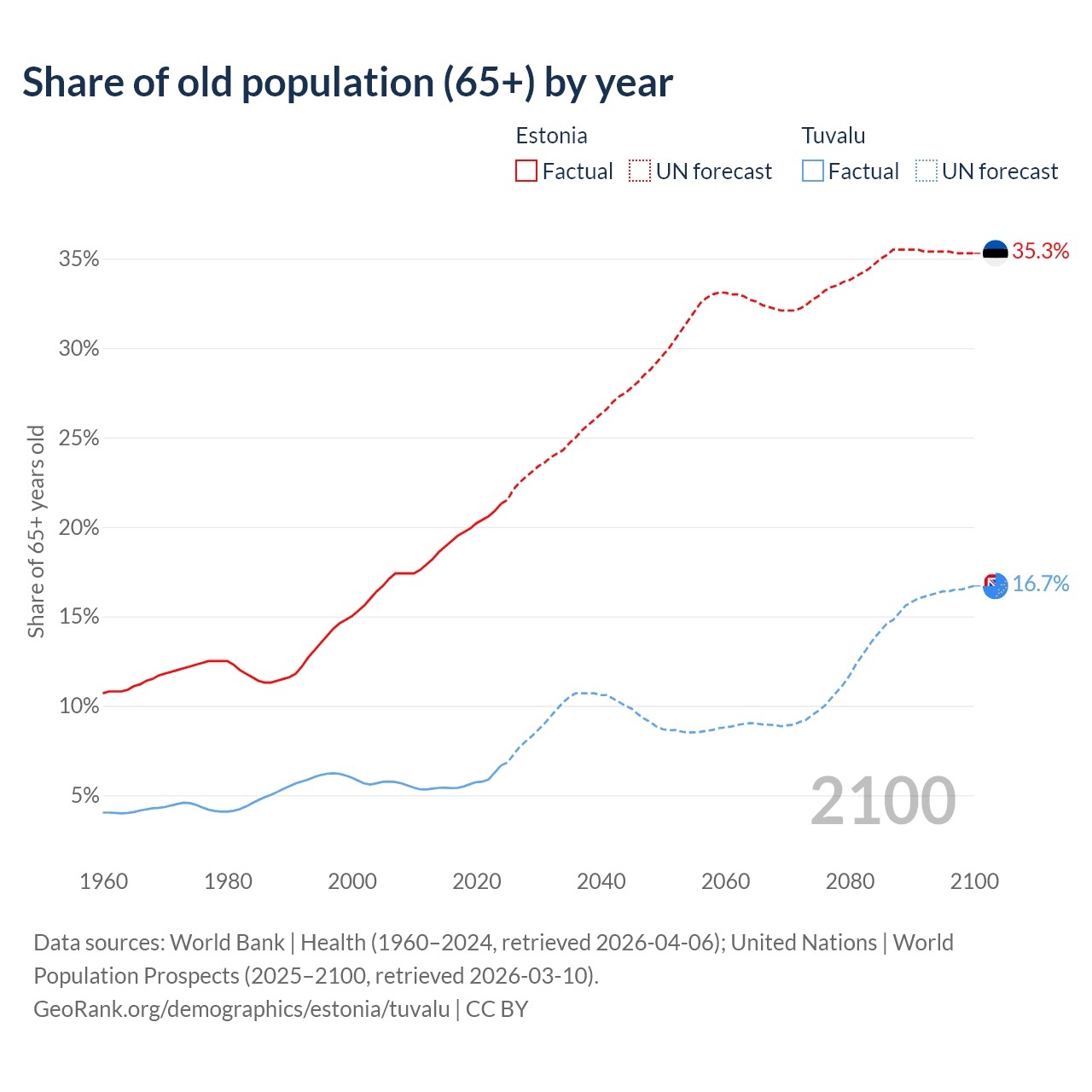 The share of older people aged 65 and over is 21.3% in Estonia and 6.67% in Tuvalu. Life expectancy in Estonia compared to Tuvalu .