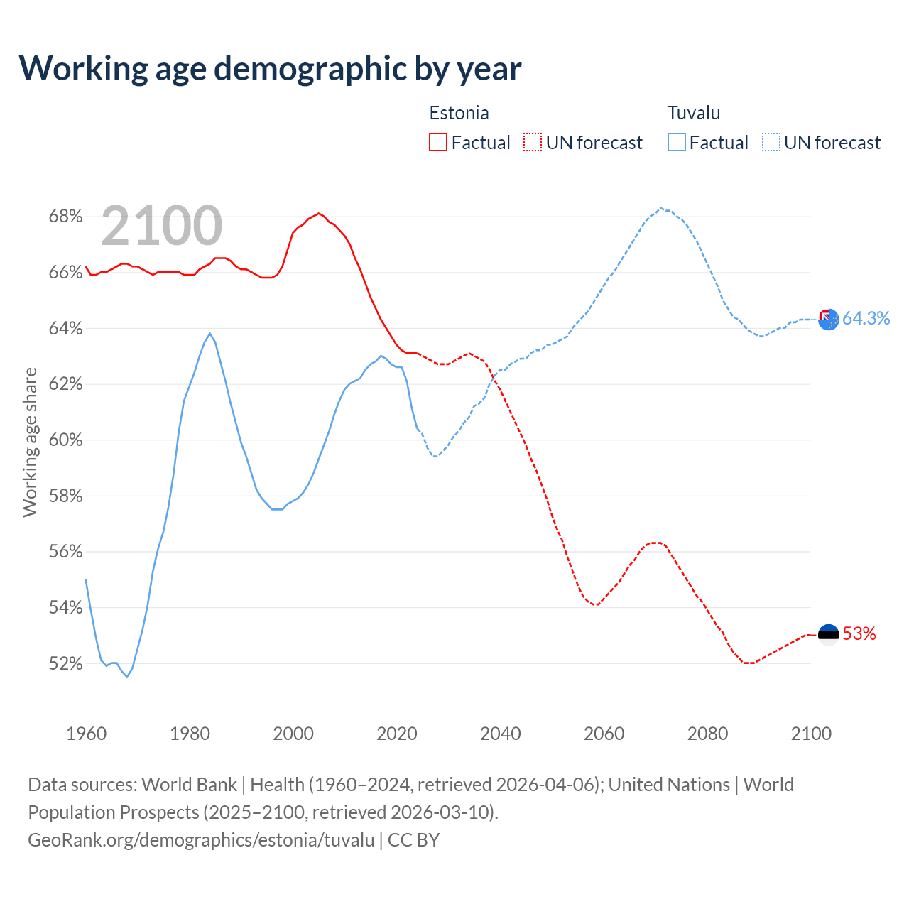 - Estonia has 845K working age adults (aged 15-64) vs 5.64K in Tuvalu.