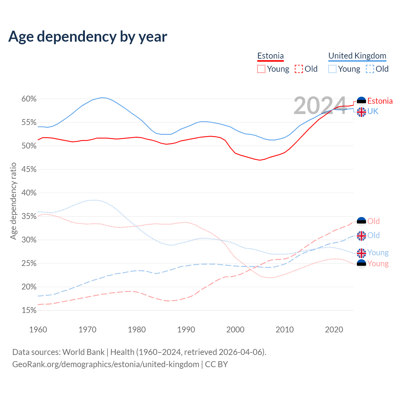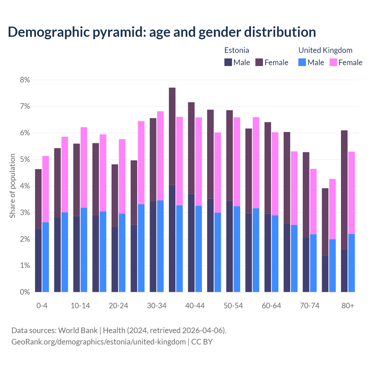 - Estonia is ranked 25/196 by median age (oldest to youngest) vs 41/196 for the United Kingdom.