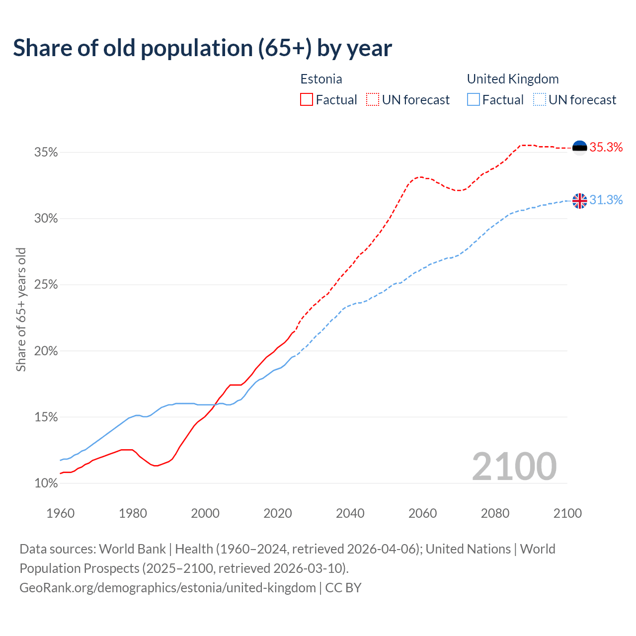 The share of older people aged 65 and over is 21.3% in Estonia and 19.5% in the United Kingdom. Life expectancy in Estonia compared to the United Kingdom .
