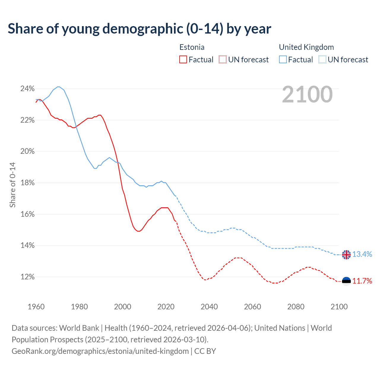 - The share of young demographic (0-15 years old) in Estonia is 15.6% vs 17.2% in the United Kingdom.