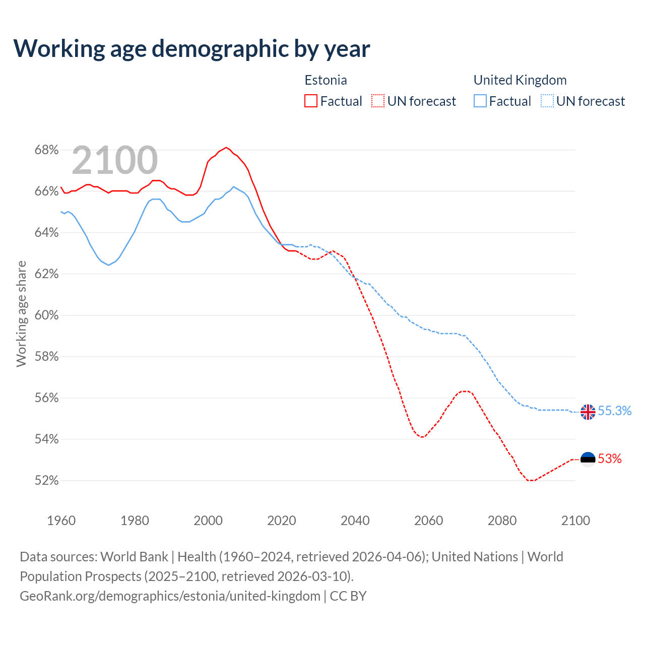 - Estonia has 845K working age adults (aged 15-64) vs 44.4M in the United Kingdom.