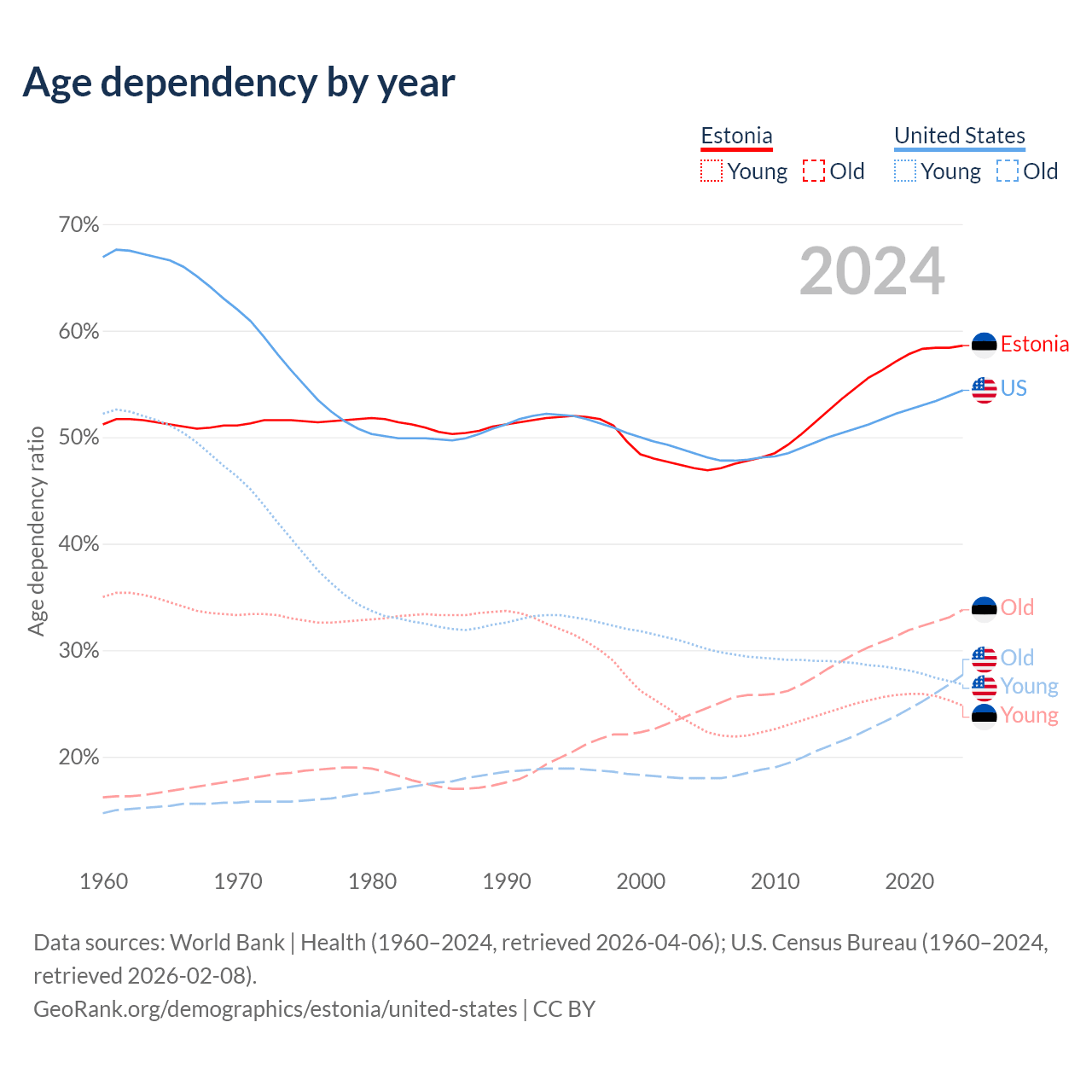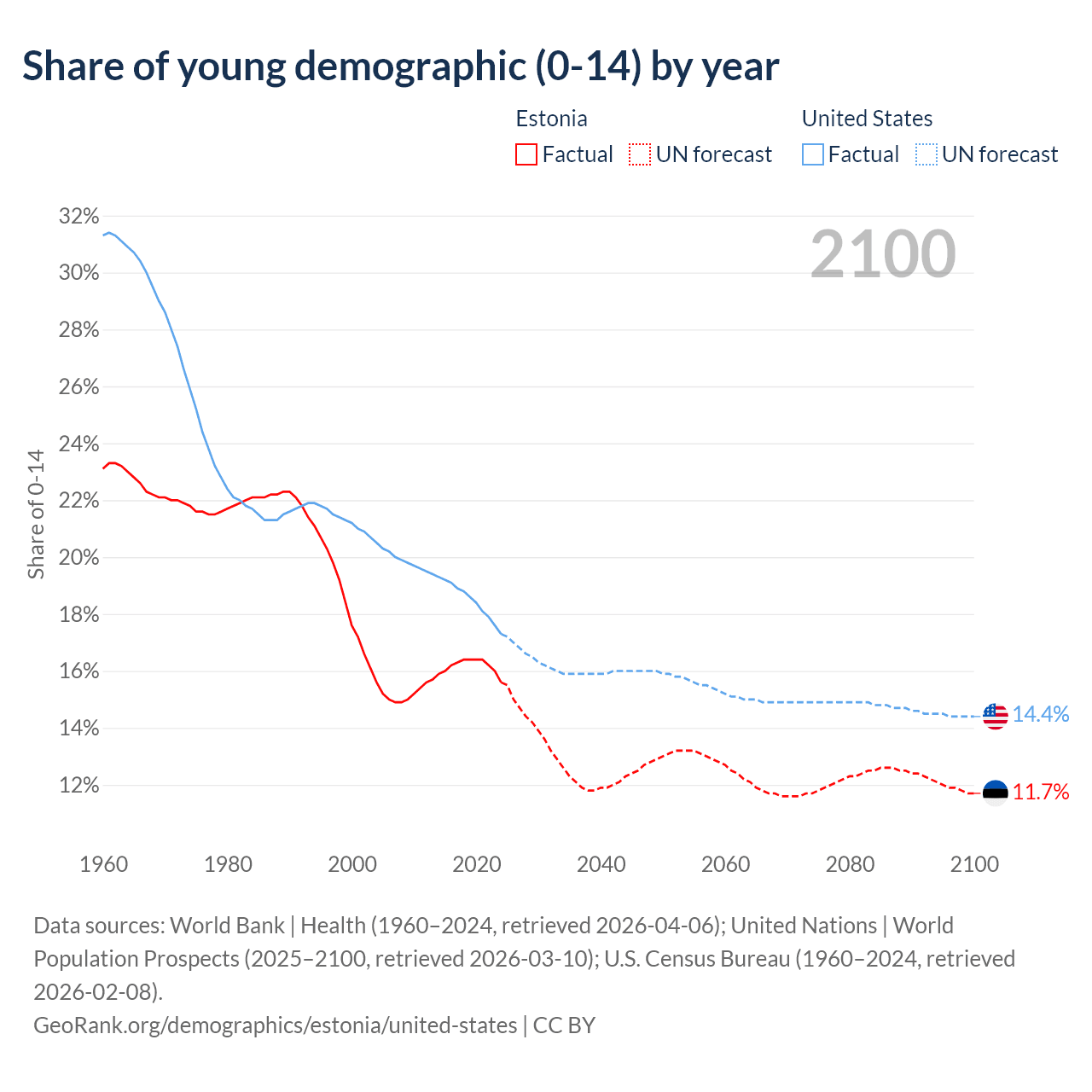 - The share of young demographic (0-15 years old) in Estonia is 15.6% vs 17.3% in the United States.