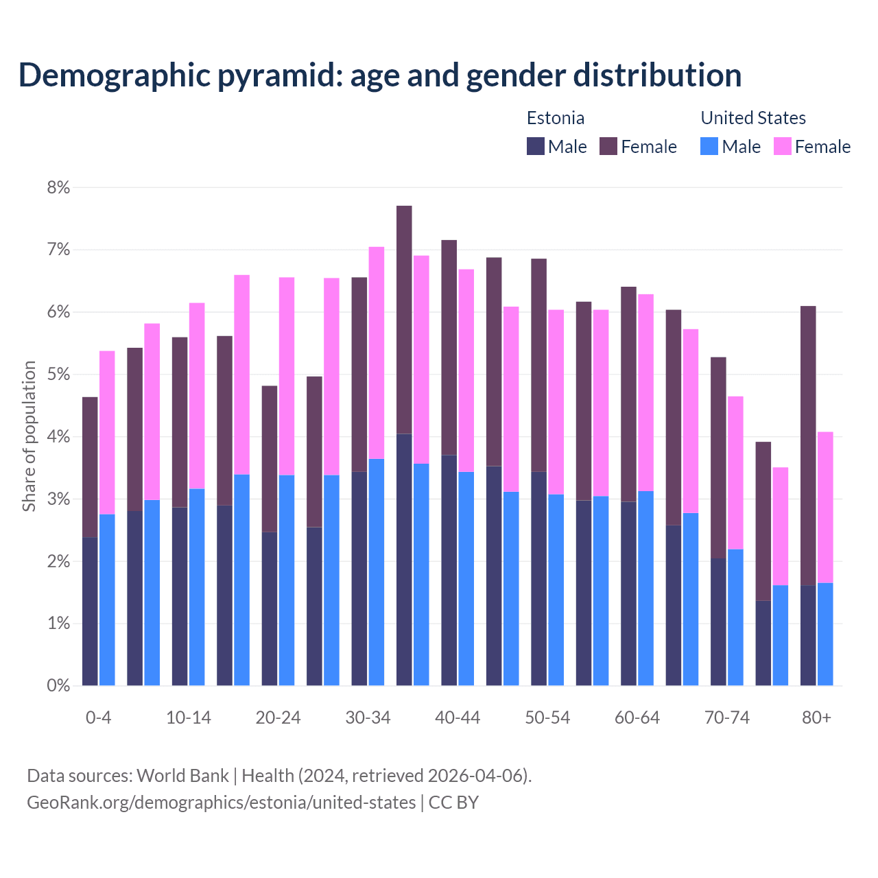 - Estonia is ranked 25/196 by median age (oldest to youngest) vs 50/196 for the United States.