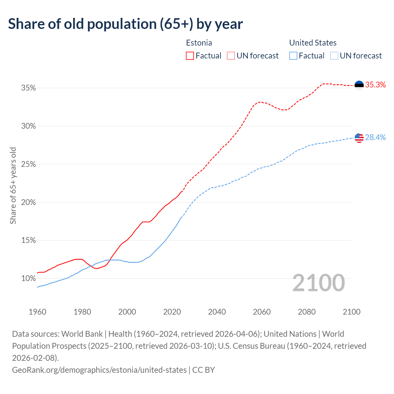The share of older people aged 65 and over is 21.3% in Estonia and 17.9% in the United States. Life expectancy in Estonia compared to the United States .