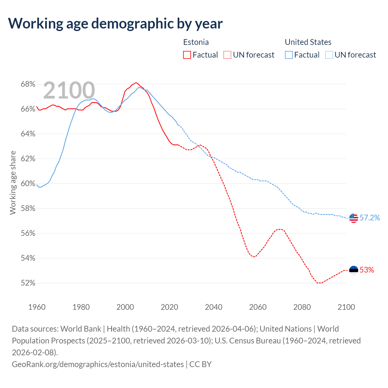 - Estonia has 845K working age adults (aged 15-64) vs 223M in the United States.