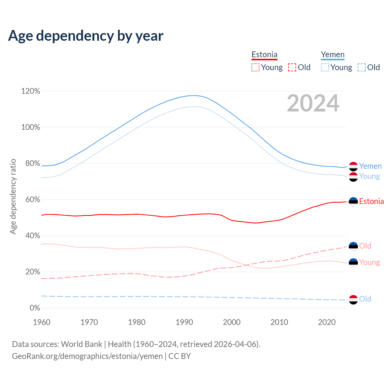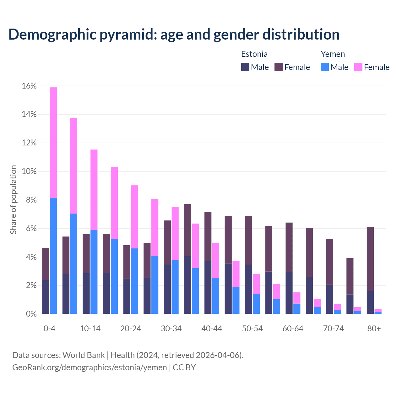 - Estonia is ranked 25/196 by median age (oldest to youngest) vs 174/196 for Yemen.