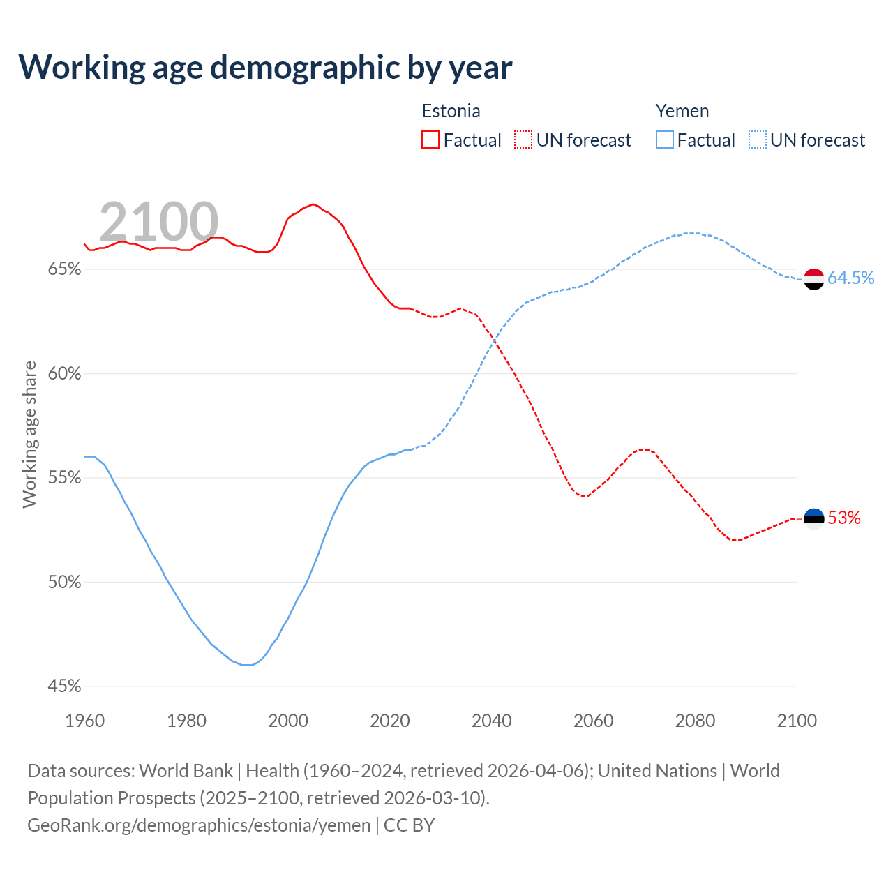 - Estonia has 845K working age adults (aged 15-64) vs 24.4M in Yemen.
