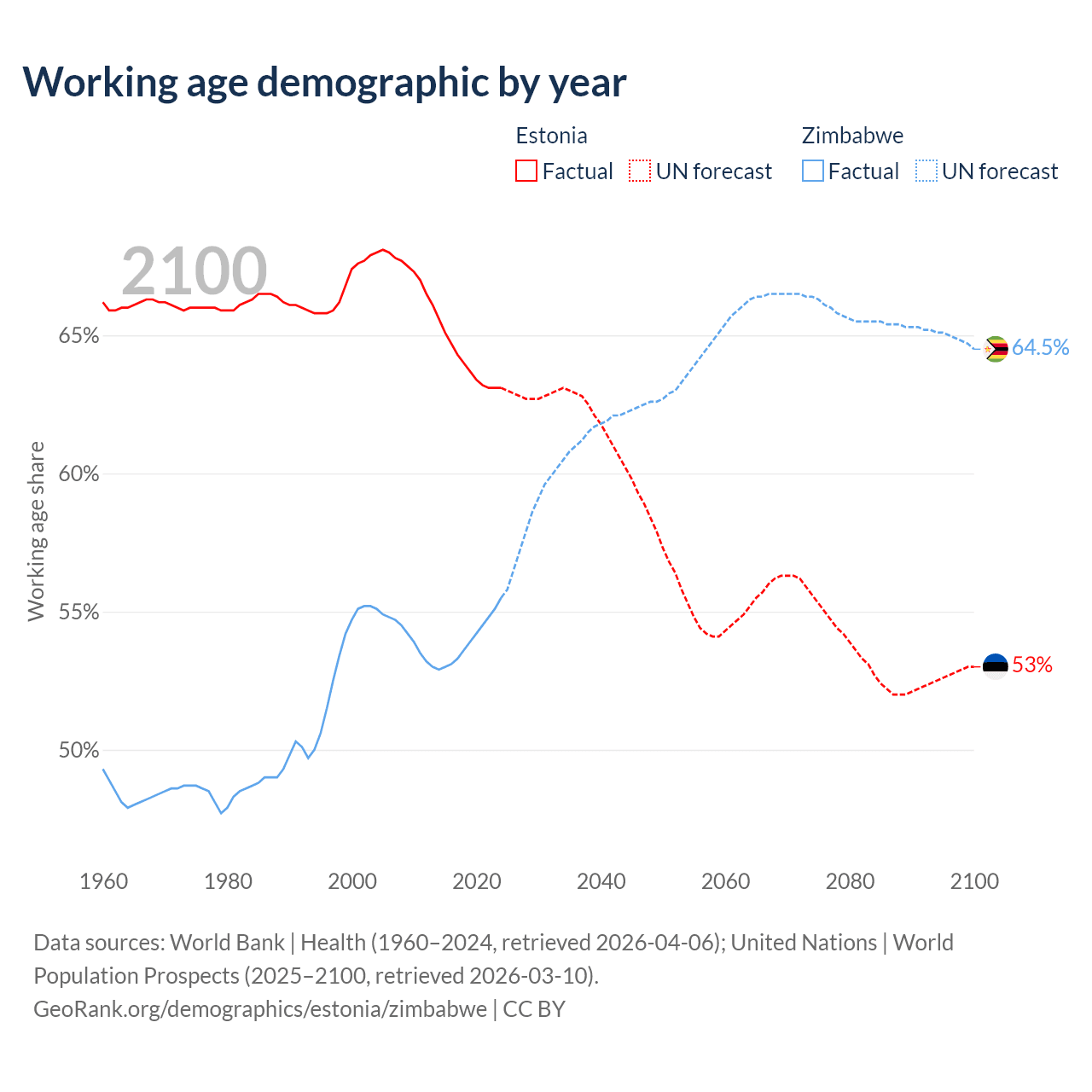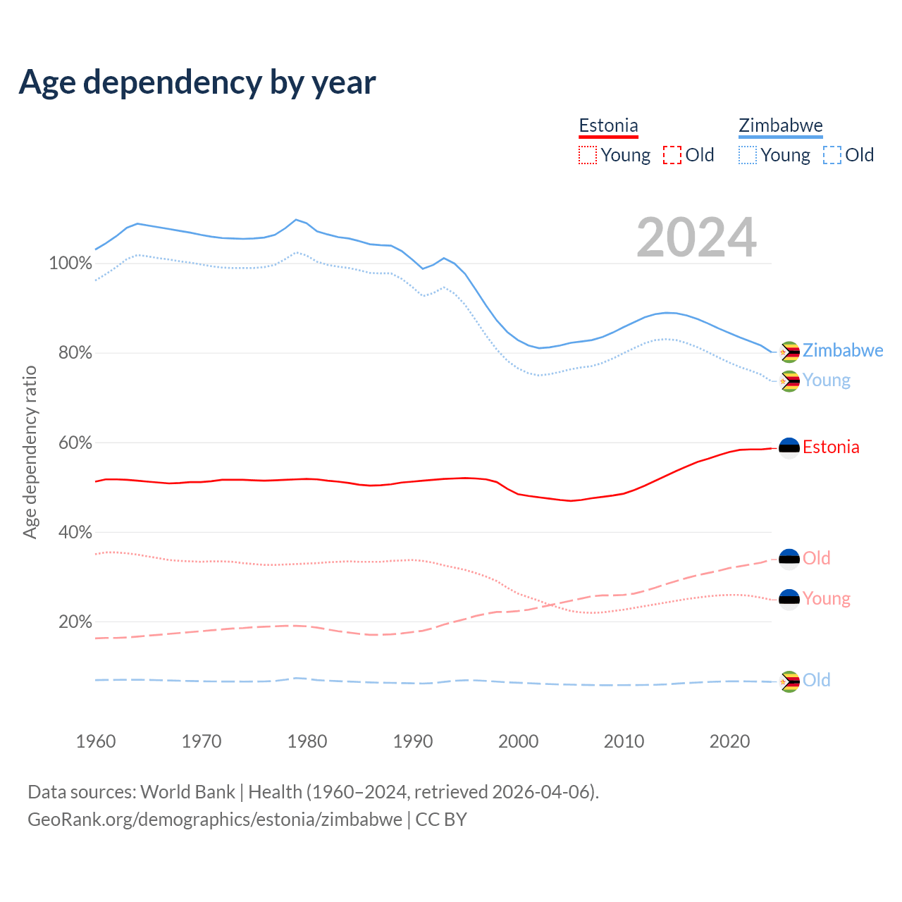 The share of older people aged 65 and over is 21.3% in Estonia and 3.6% in Zimbabwe. Life expectancy in Estonia compared to Zimbabwe .