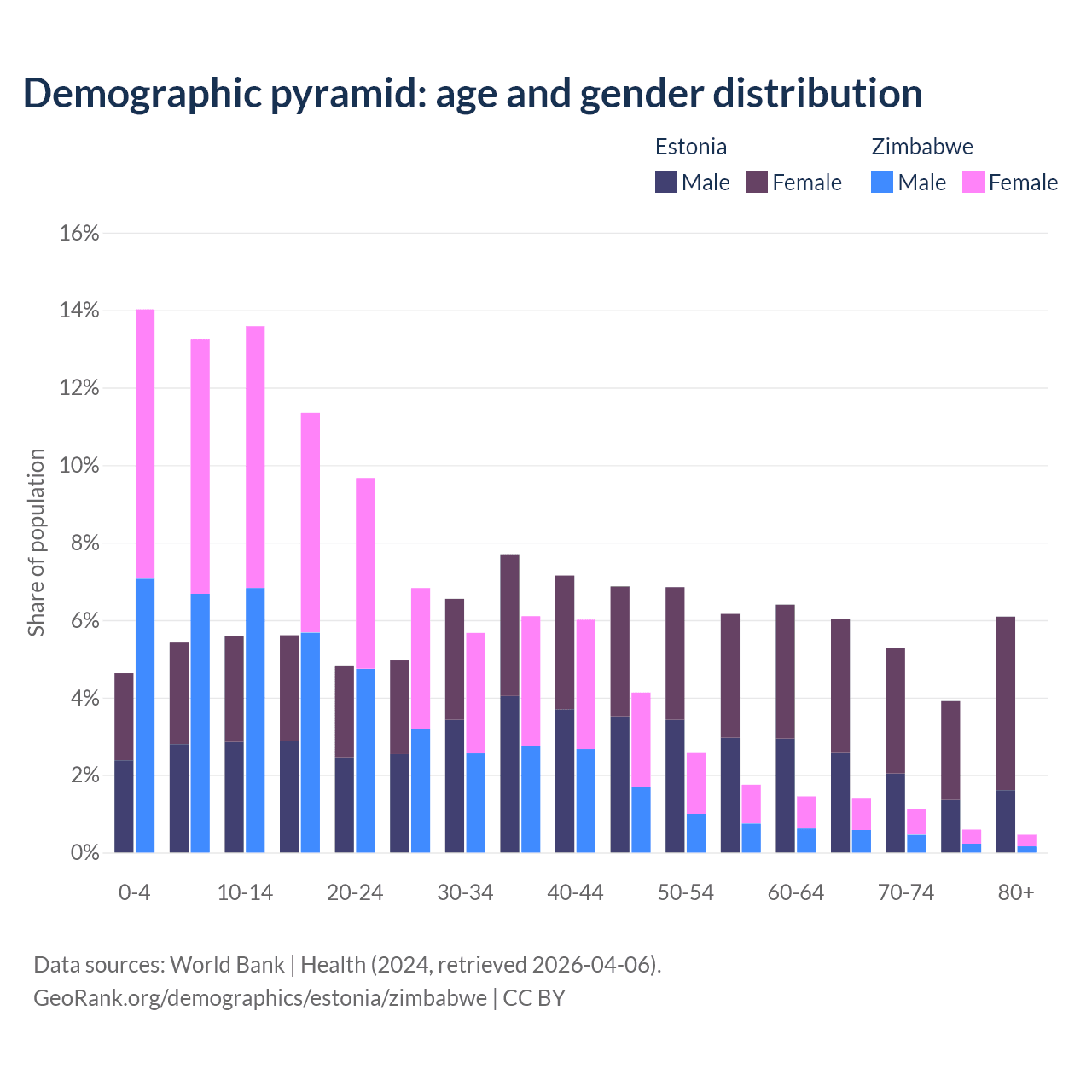 - Estonia is ranked 25/196 by median age (oldest to youngest) vs 177/196 for Zimbabwe.