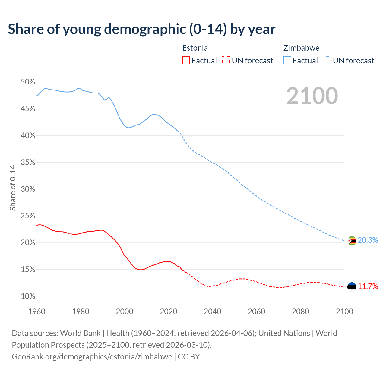 - The share of young demographic (0-15 years old) in Estonia is 15.6% vs 40.9% in Zimbabwe.