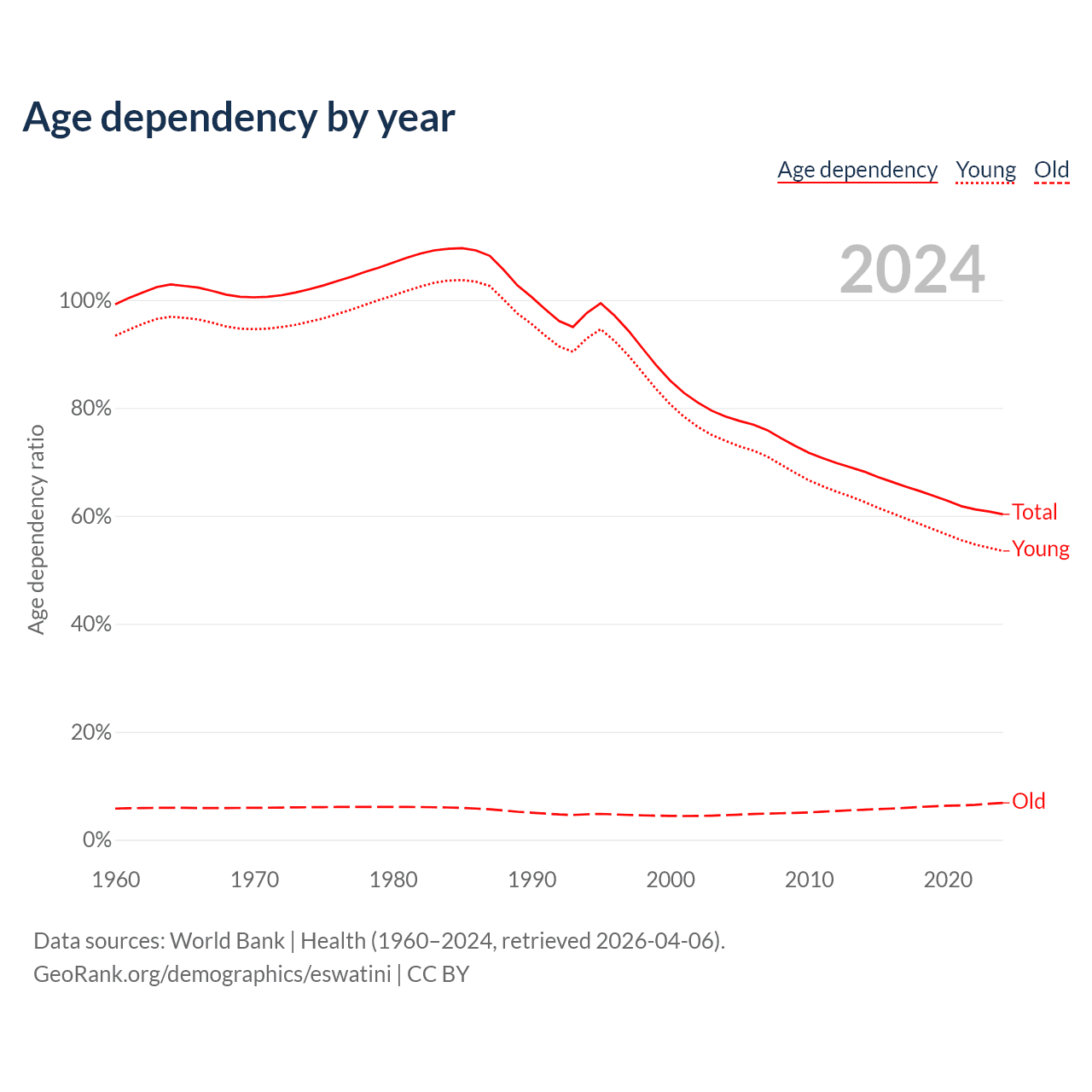 Data sources: World Bank | Health (1960–2024, retrieved 2026-04-06); U.S. Census Bureau (1960–2024, retrieved 2026-02-08).