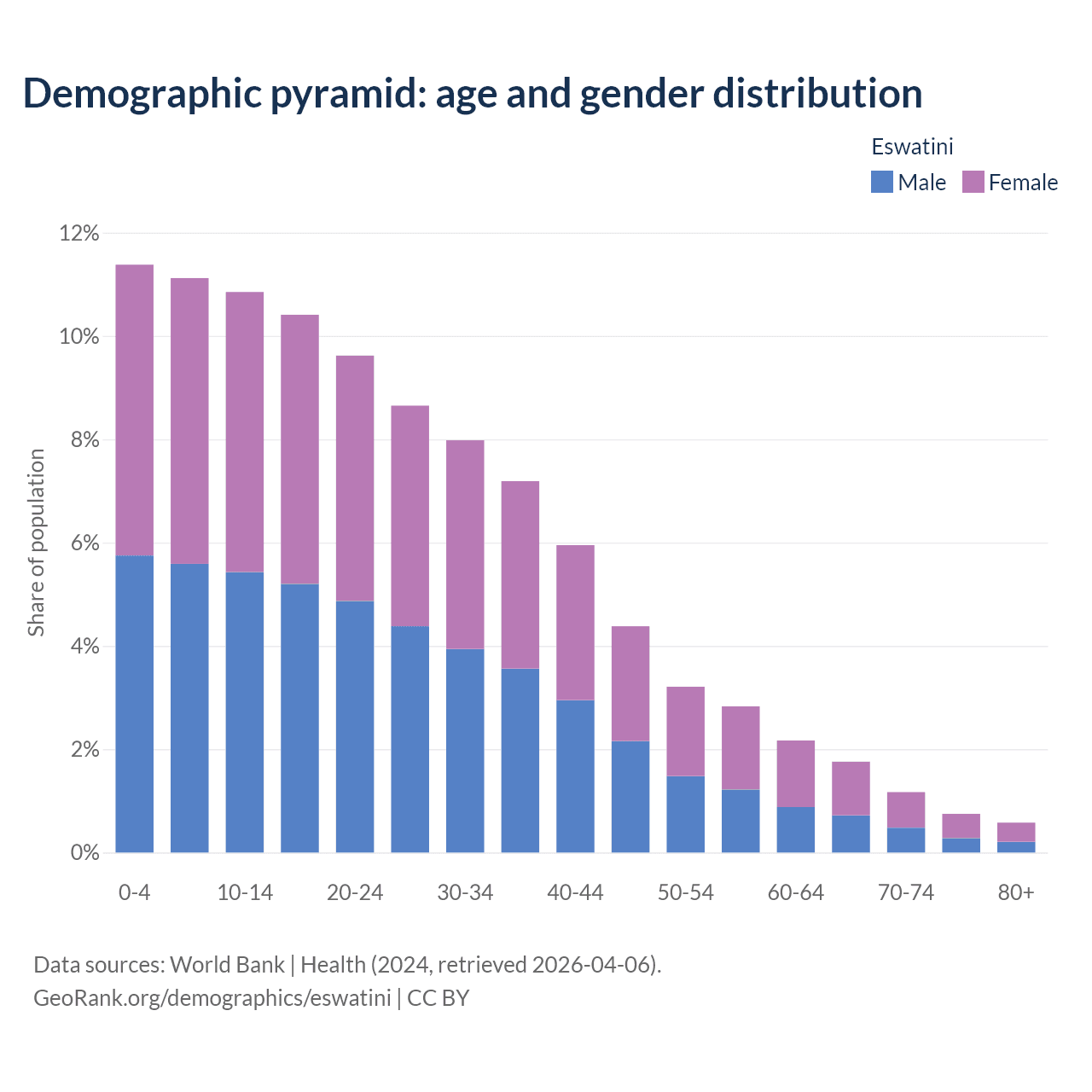 The share of children aged 0-14 in Eswatini decreased from 41.4% to 33.4% between 2004 and 2024 due to changes in birth rates.