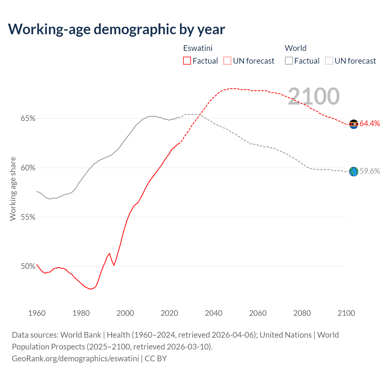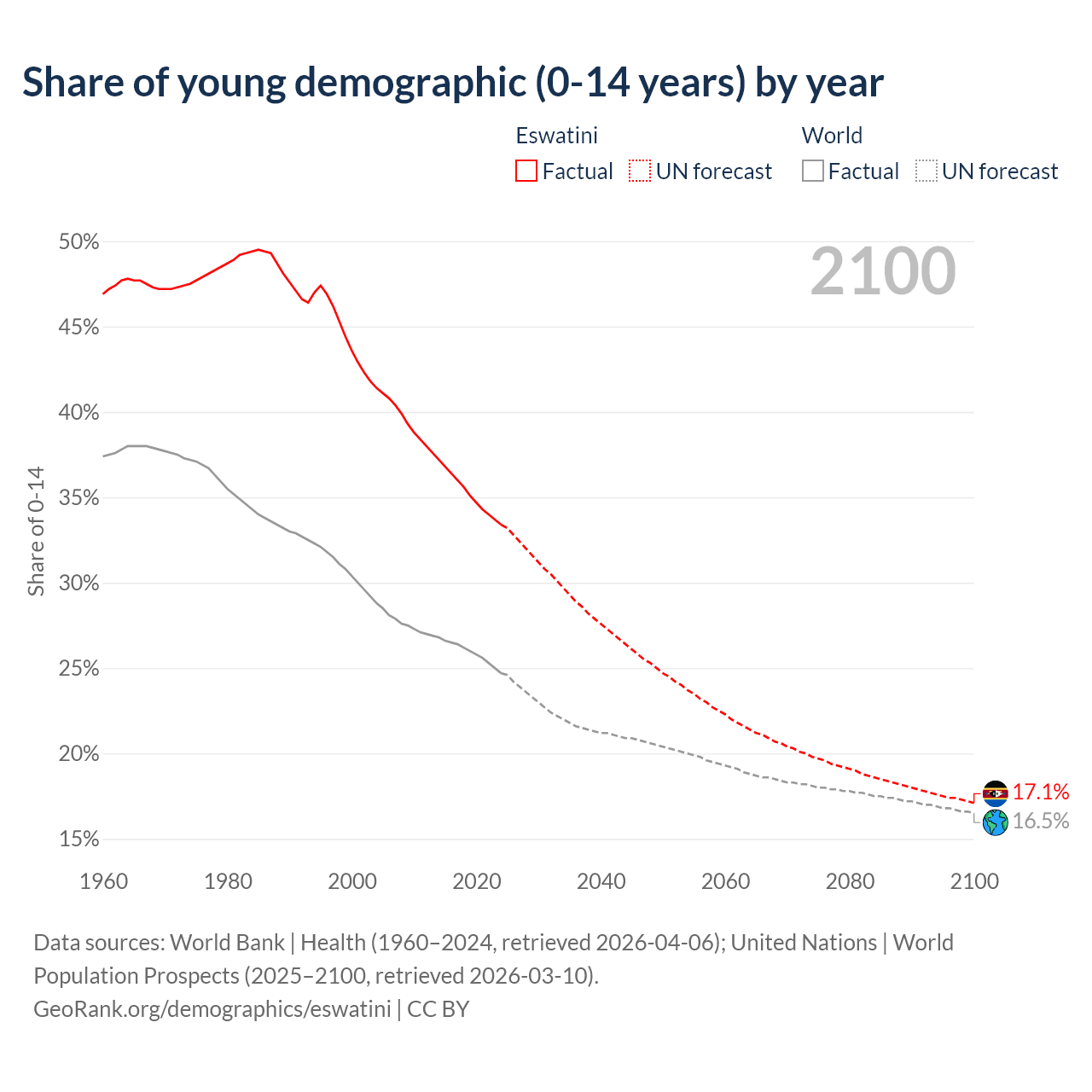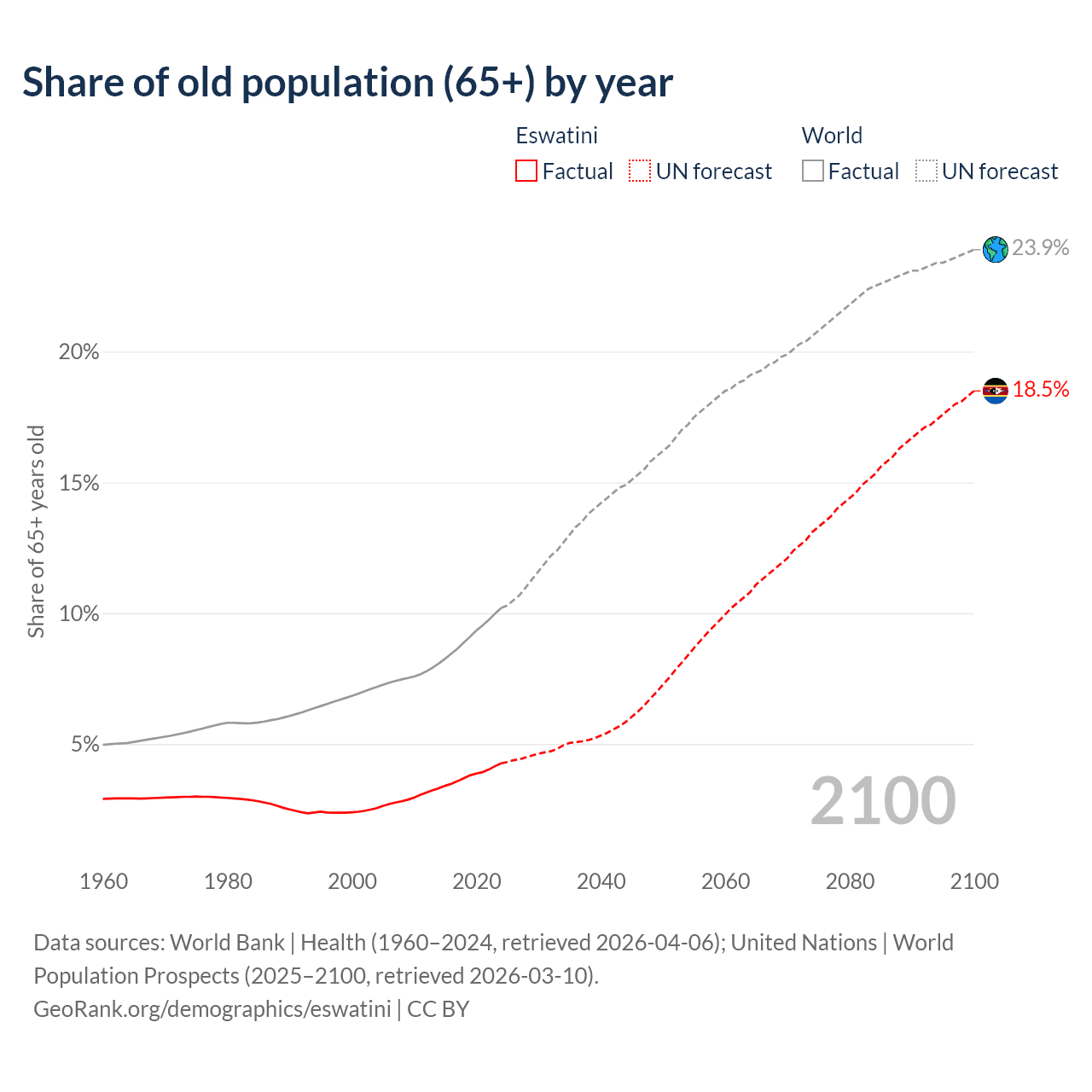 Median age in Eswatini, 1960–2100