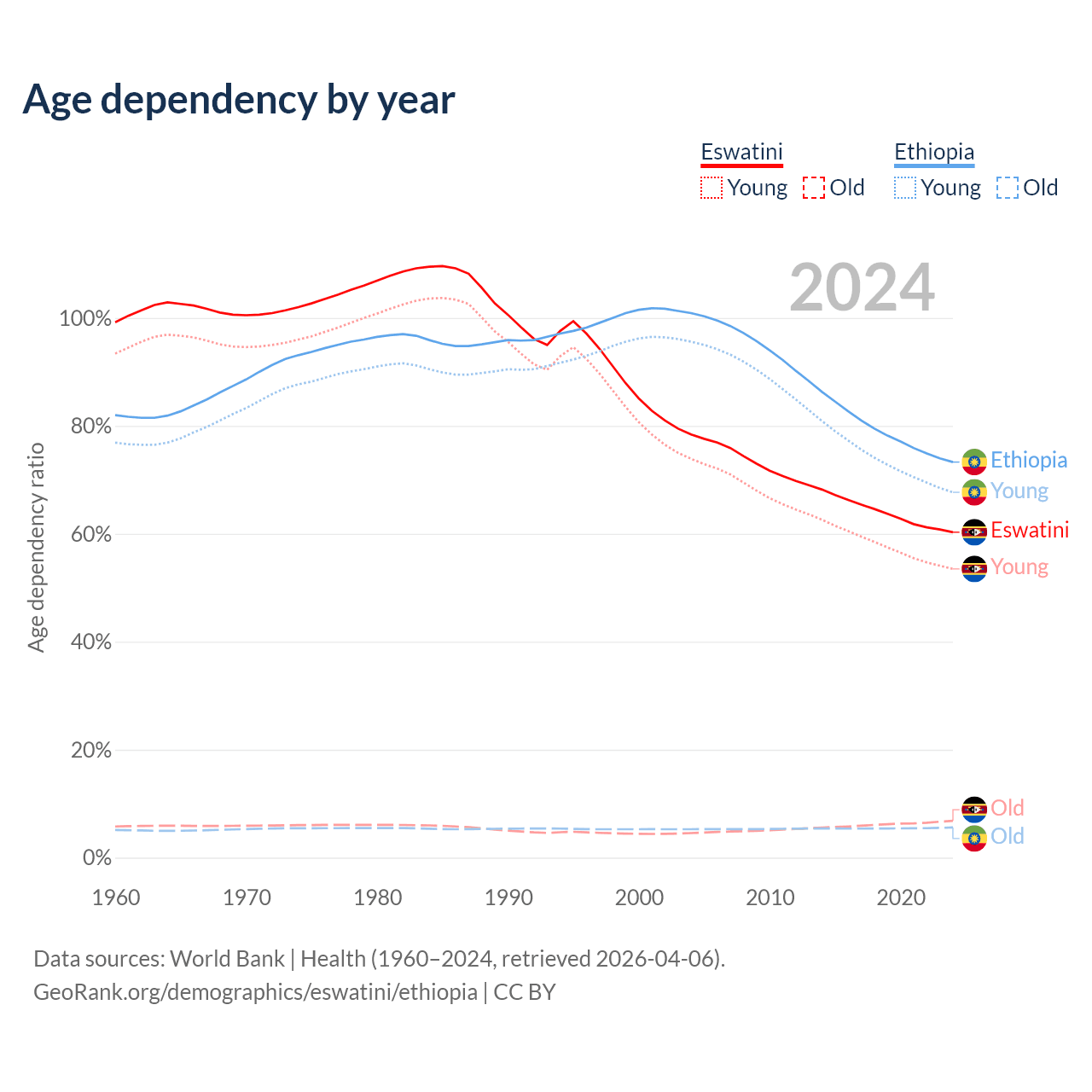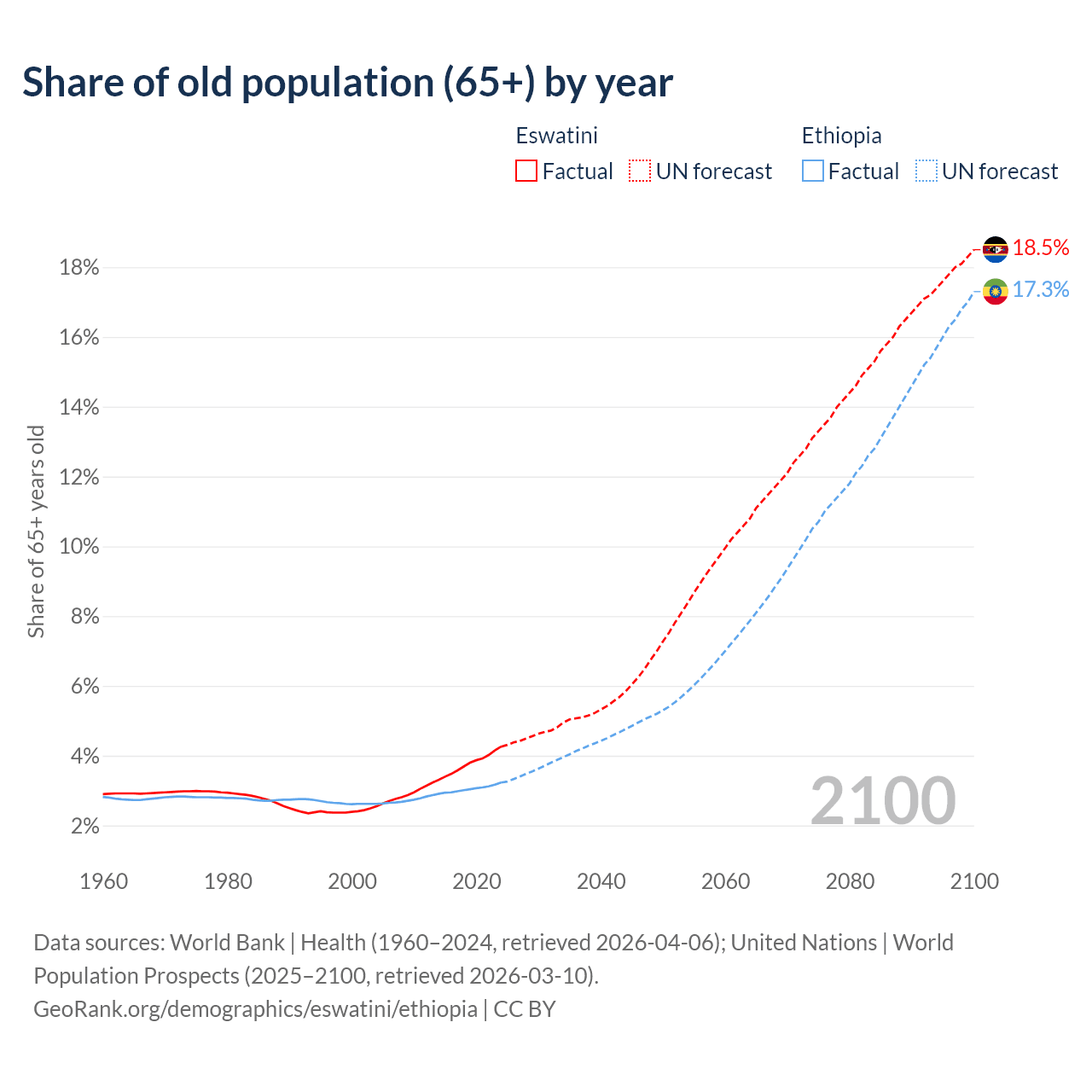 - The share of old-age demographic (65+) in Eswatini is 4.26% vs 3.23% in Ethiopia.