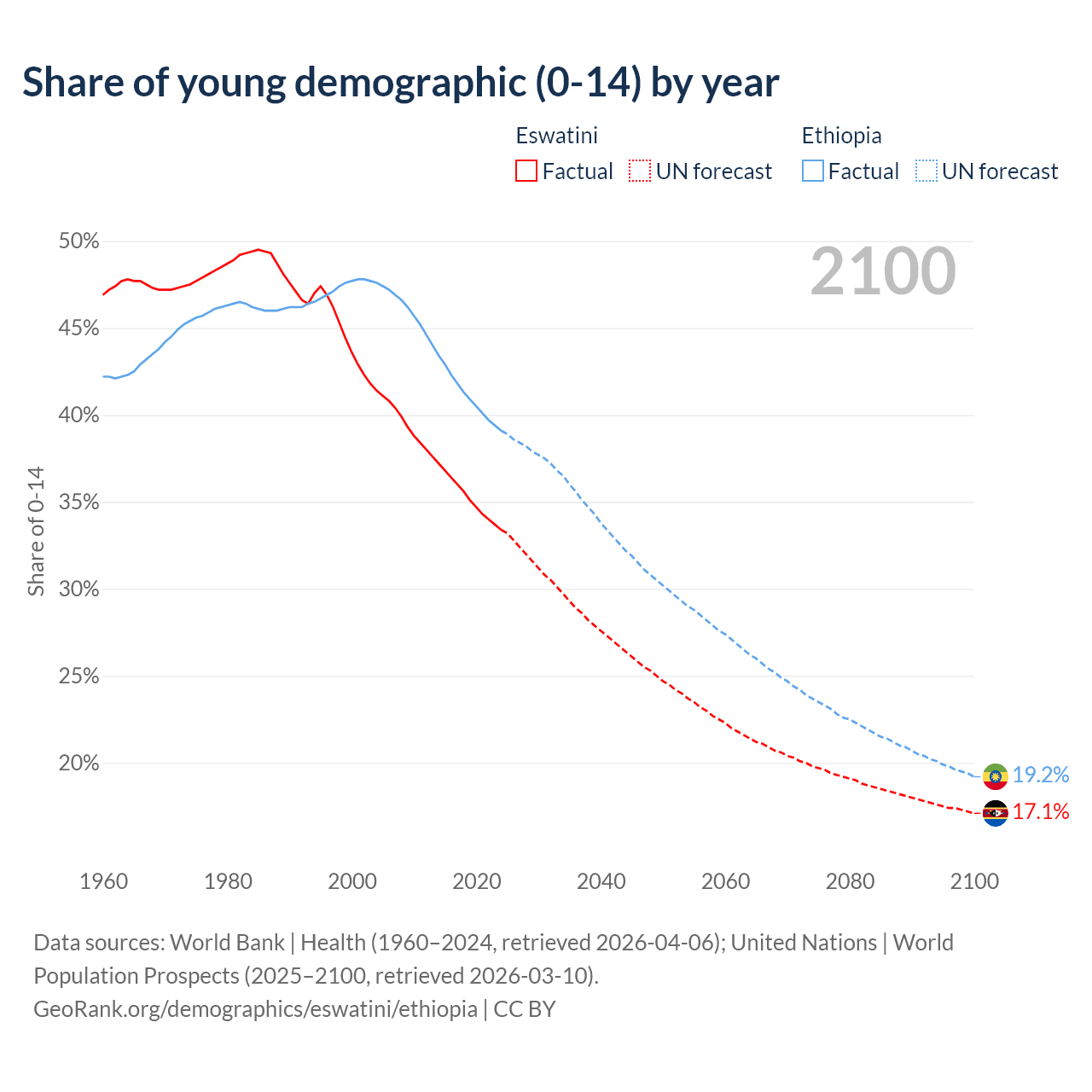 Median age Eswatini vs Ethiopia, 1960-2100