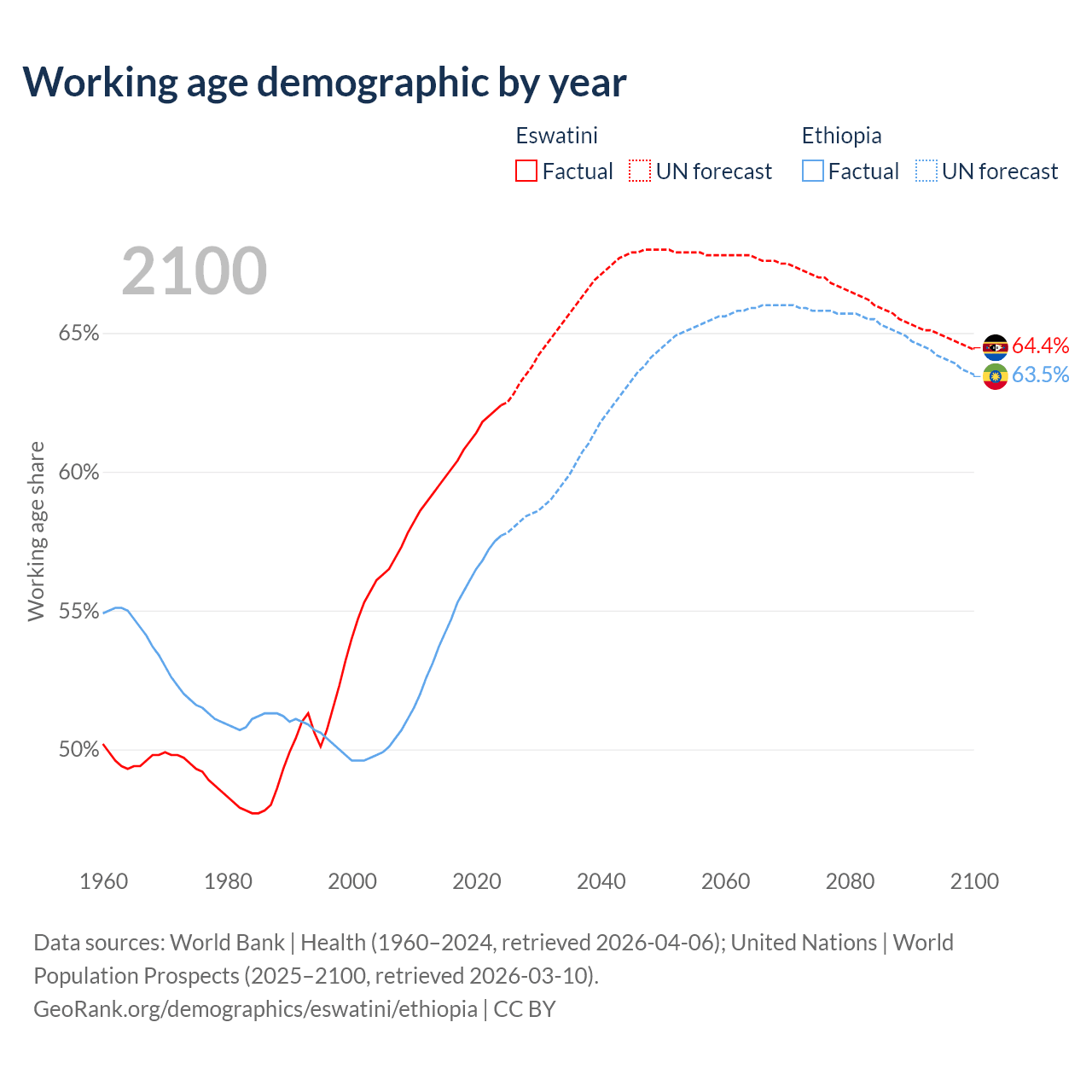 The share of older people aged 65 and over is 4.26% in Eswatini and 3.23% in Ethiopia. Life expectancy in Eswatini compared to Ethiopia .