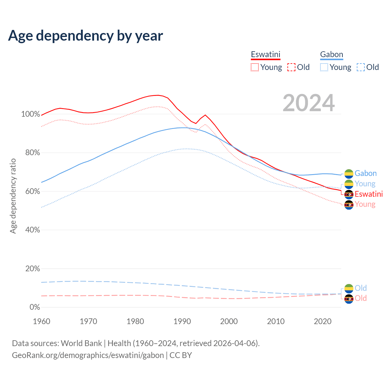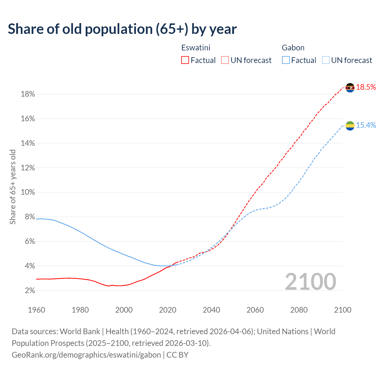 - The share of old-age demographic (65+) in Eswatini is 4.26% vs 4.08% in Gabon.