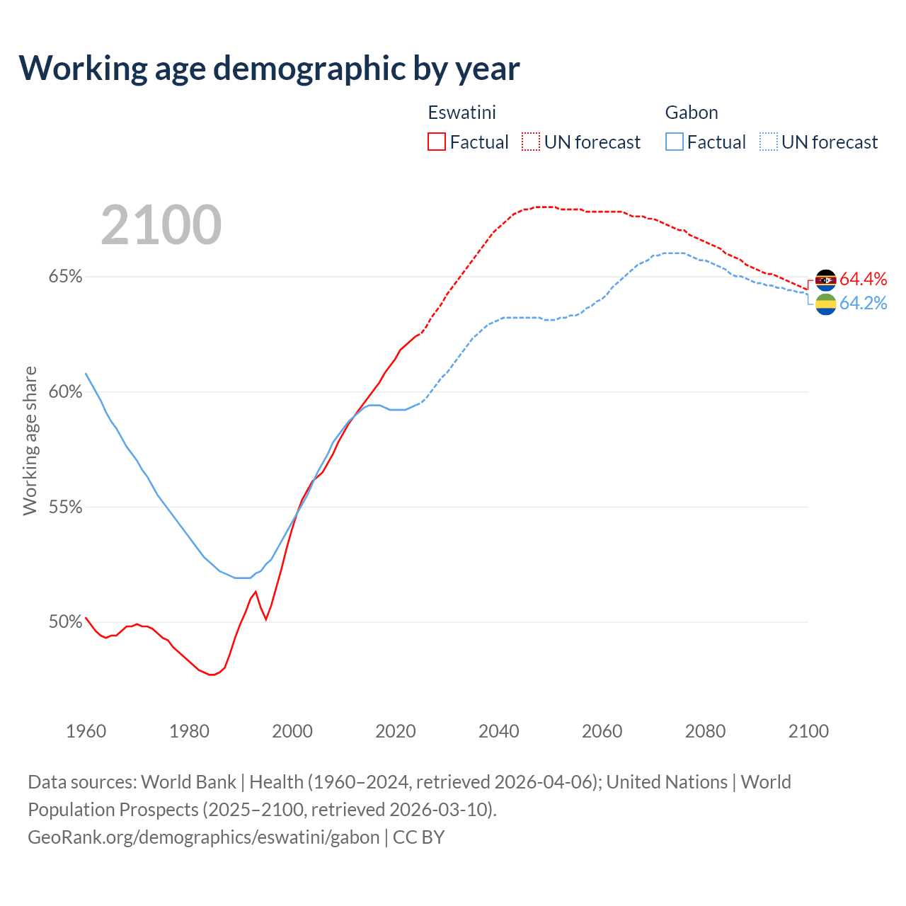 - Eswatini has 794K working age adults (aged 15-64) vs 1.58M in Gabon.