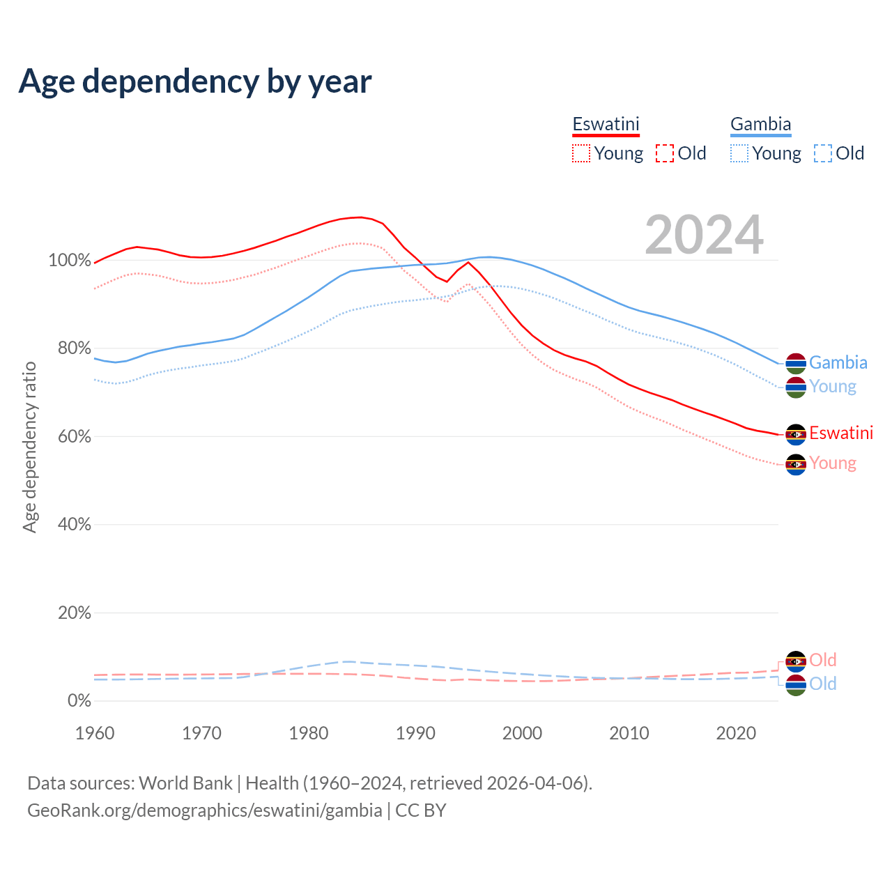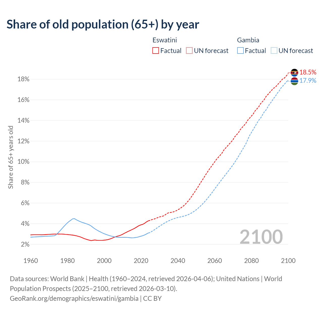 - The share of old-age demographic (65+) in Eswatini is 4.26% vs 3.08% in the Gambia.