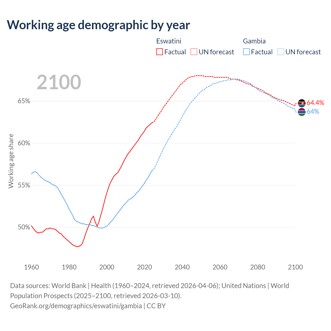 - Eswatini has 794K working age adults (aged 15-64) vs 1.64M in the Gambia.