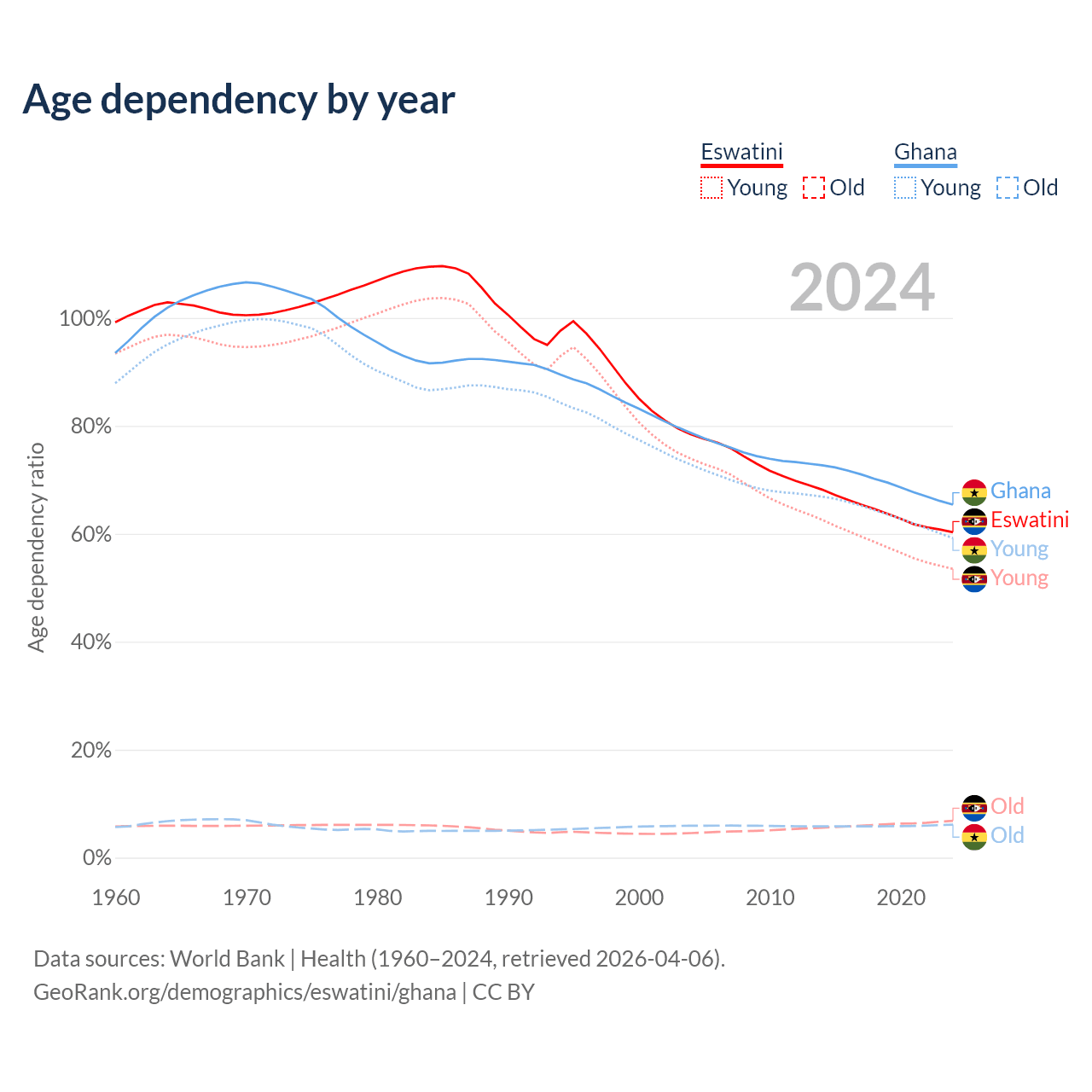 - The share of old-age demographic (65+) in Eswatini is 4.26% vs 3.71% in Ghana.