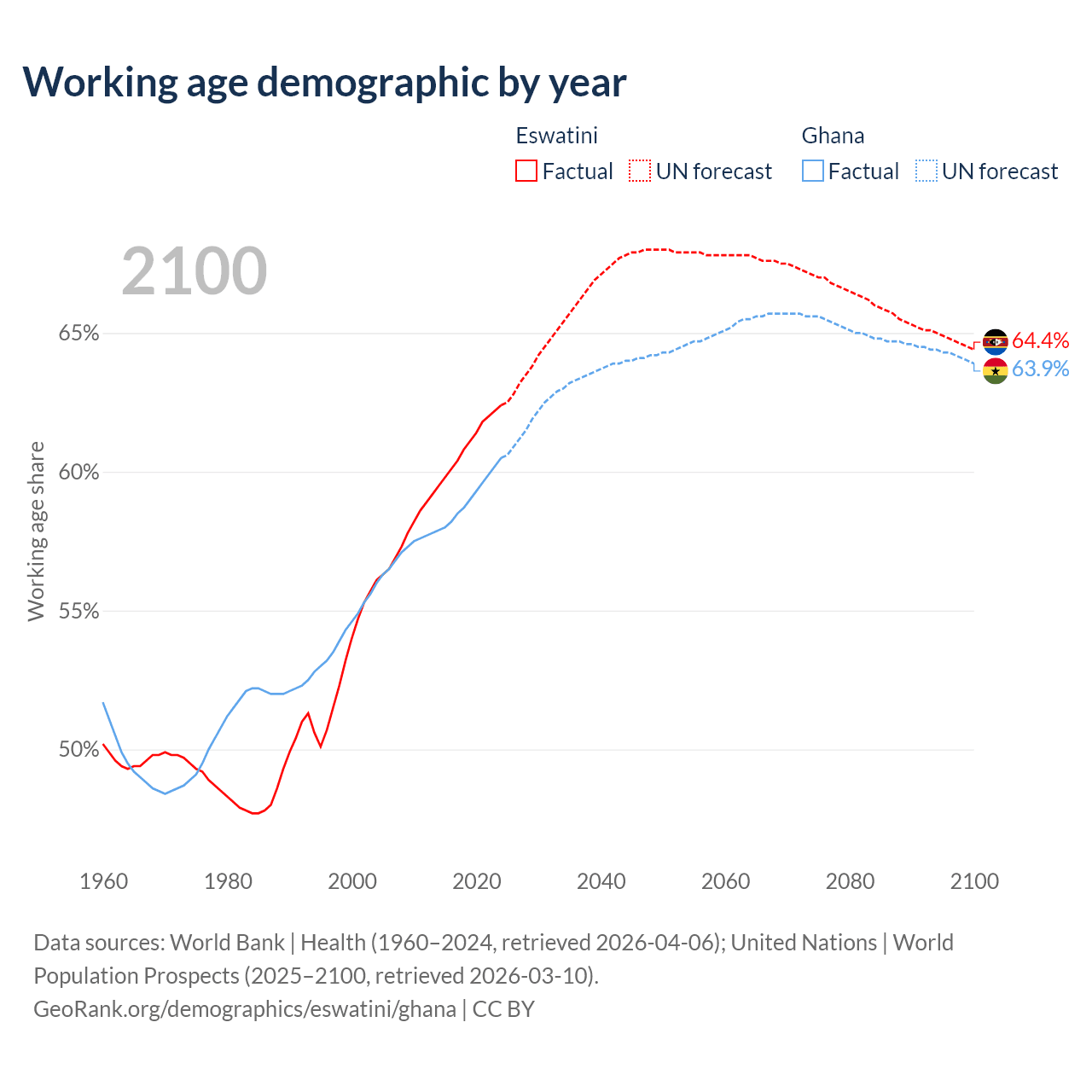 Median age Eswatini vs Ghana, 1960-2100