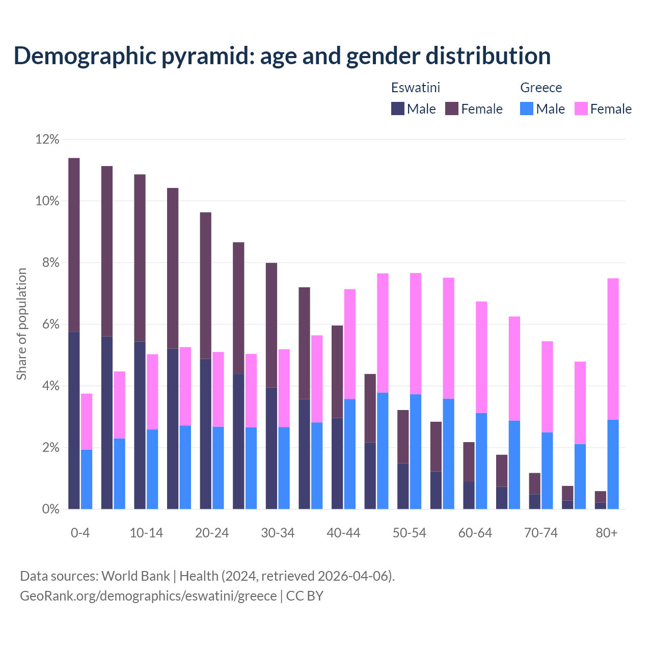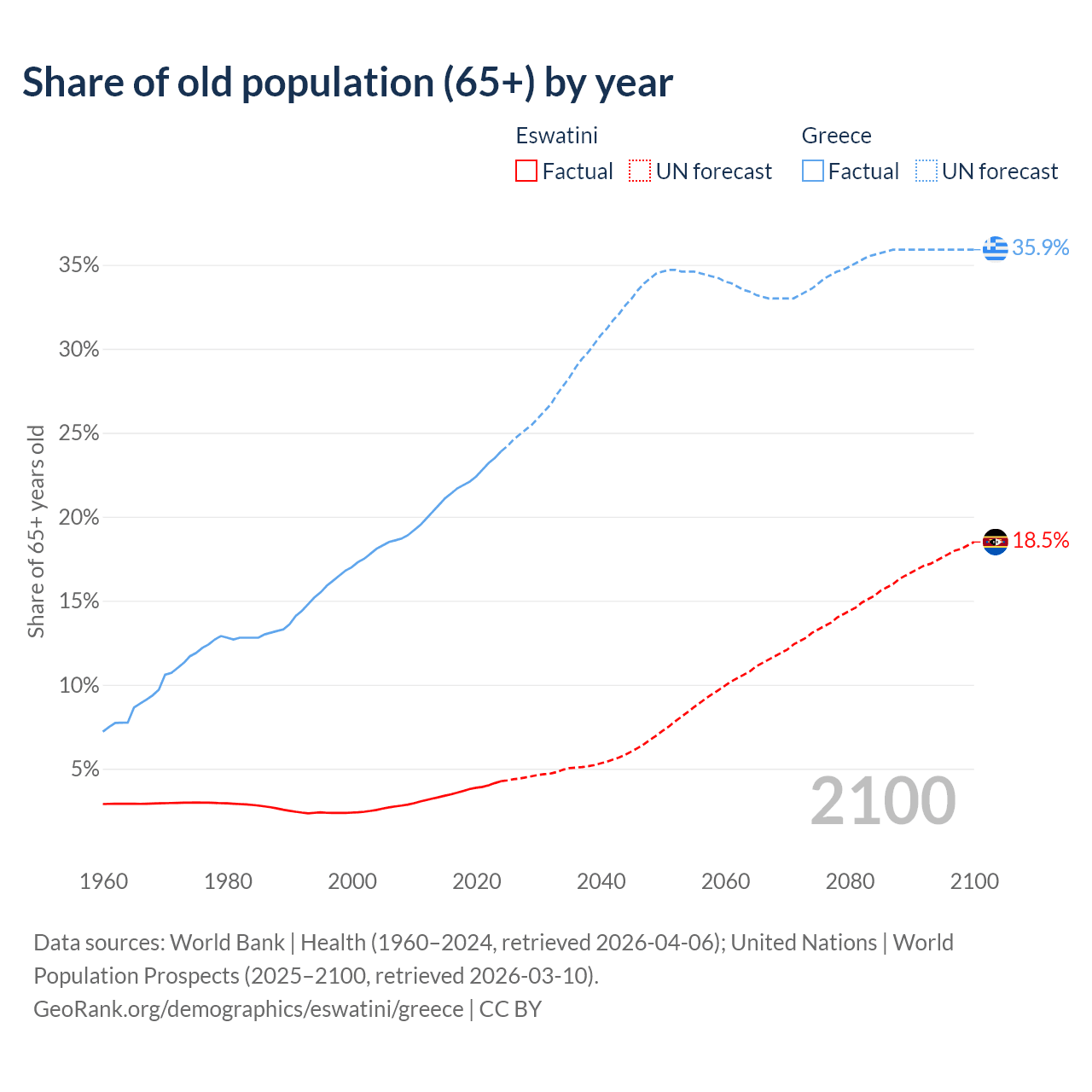 The share of older people aged 65 and over is 4.26% in Eswatini and 23.9% in Greece. Life expectancy in Eswatini compared to Greece .