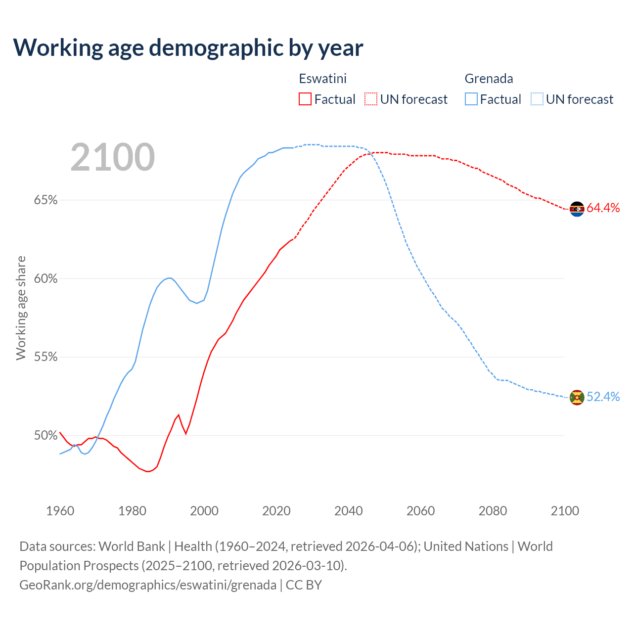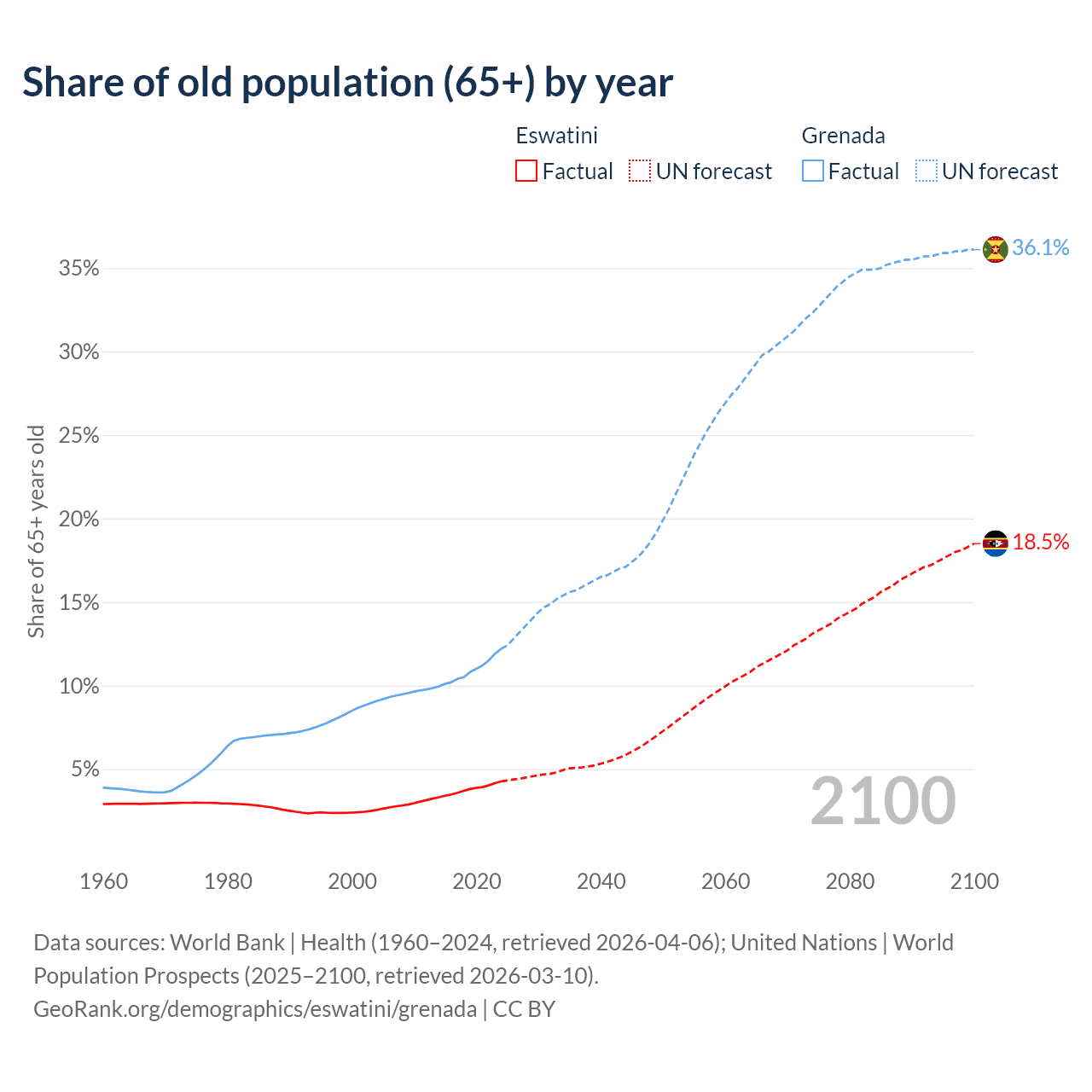 The share of older people aged 65 and over is 4.26% in Eswatini and 12.2% in Grenada. Life expectancy in Eswatini compared to Grenada .