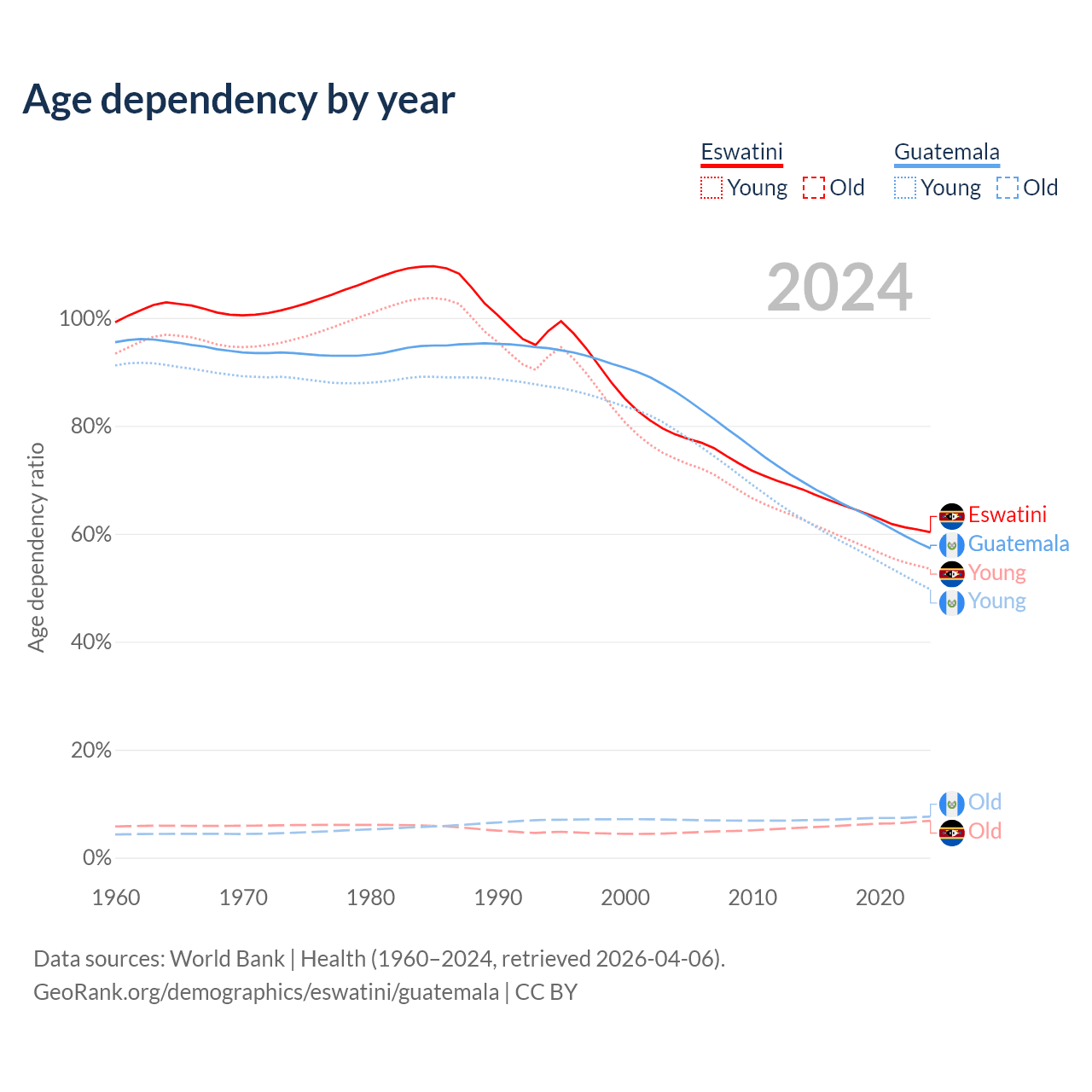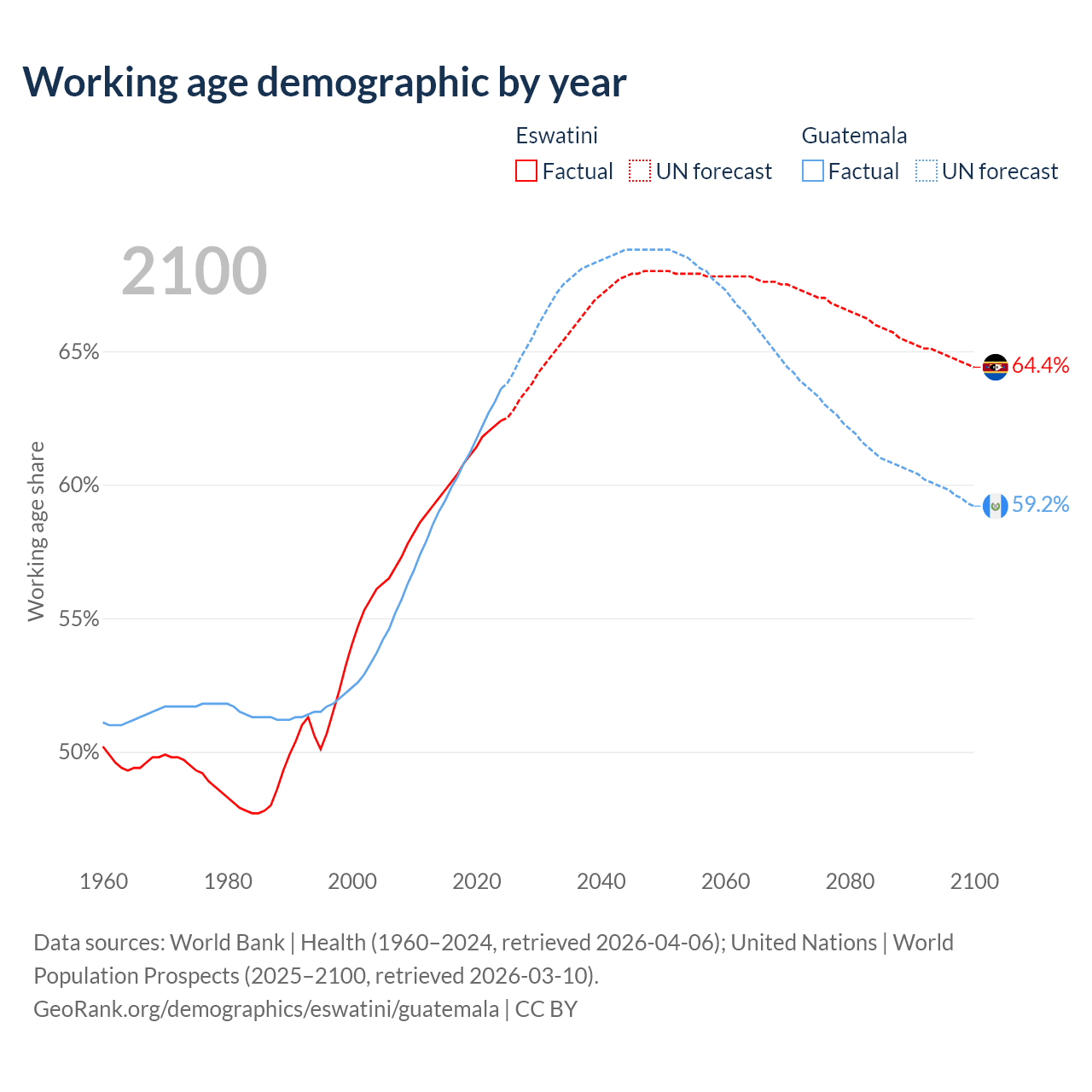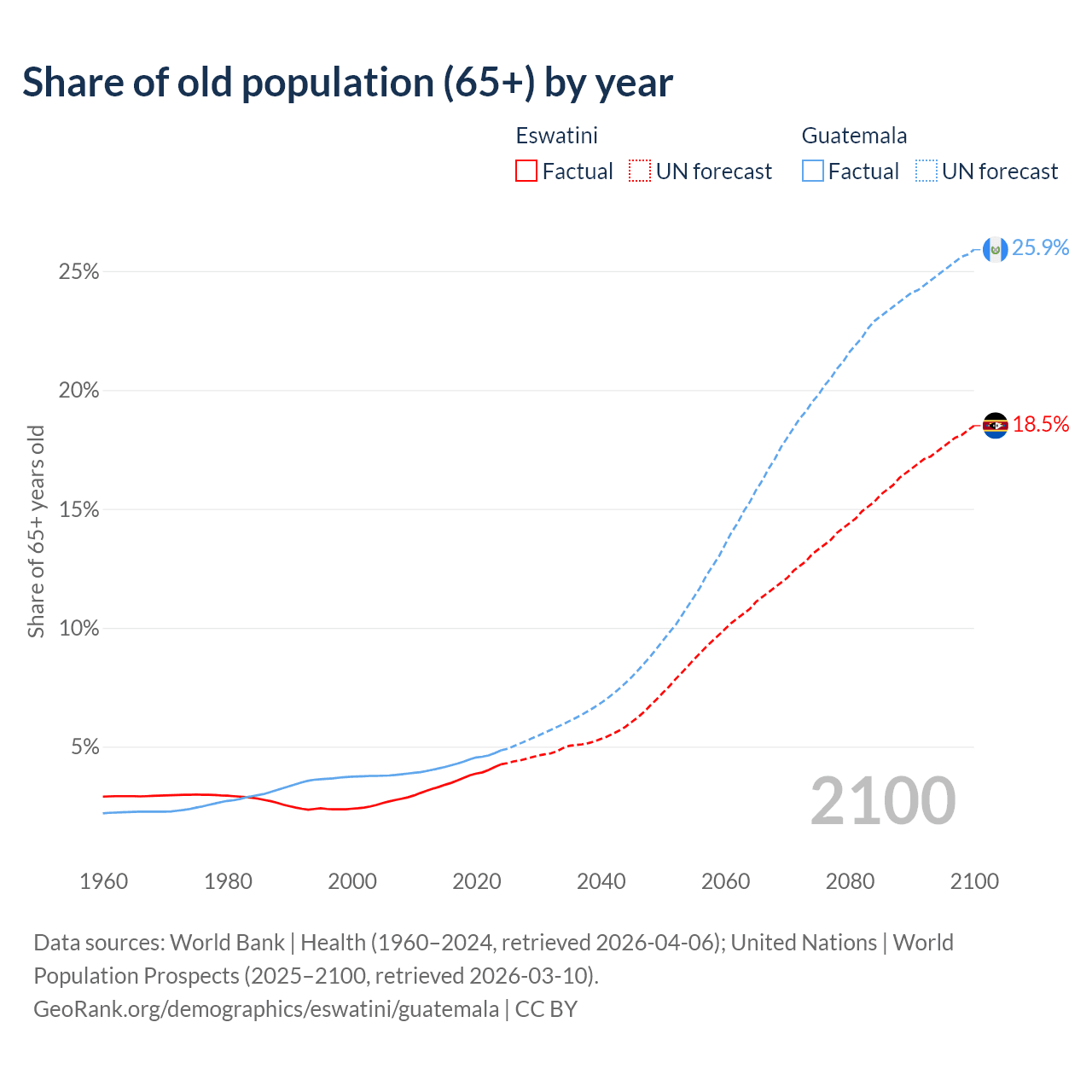 - The share of old-age demographic (65+) in Eswatini is 4.26% vs 4.85% in Guatemala.
