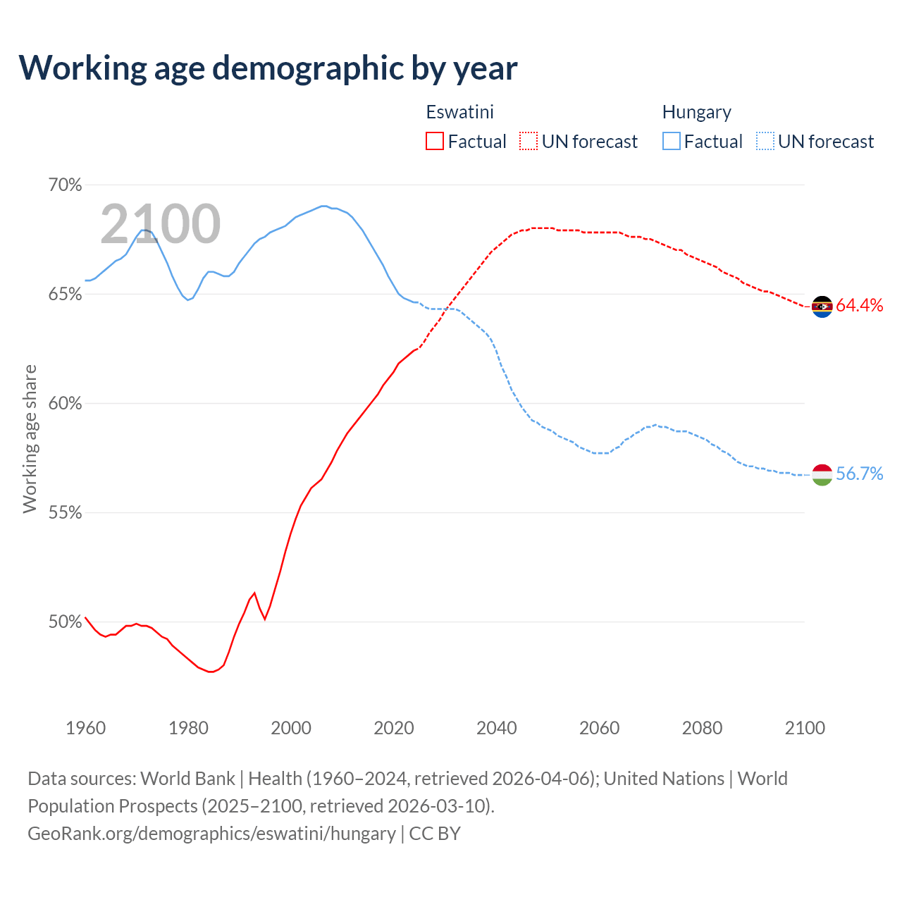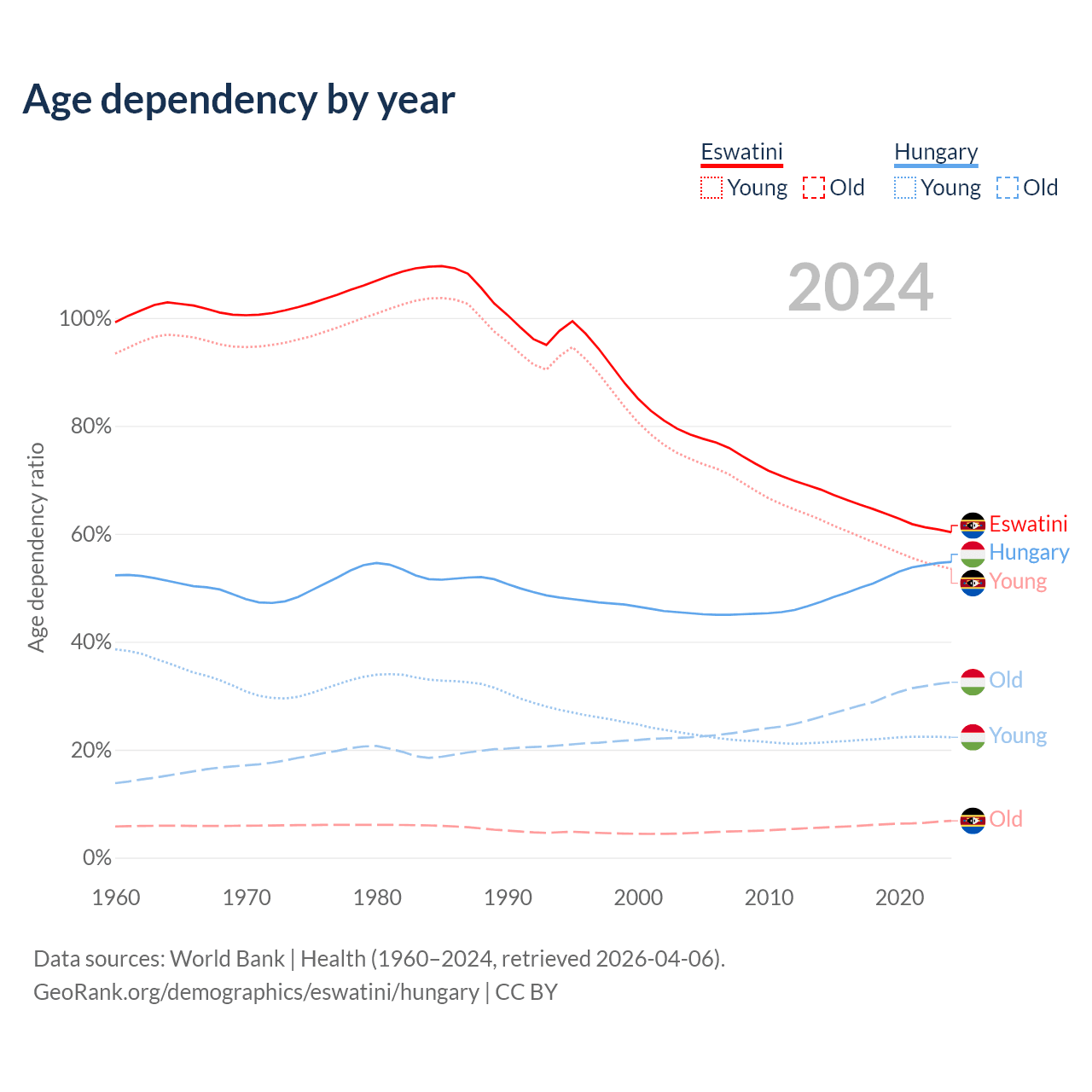 The share of older people aged 65 and over is 4.26% in Eswatini and 21% in Hungary. Life expectancy in Eswatini compared to Hungary .