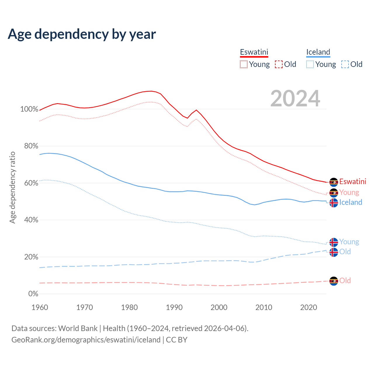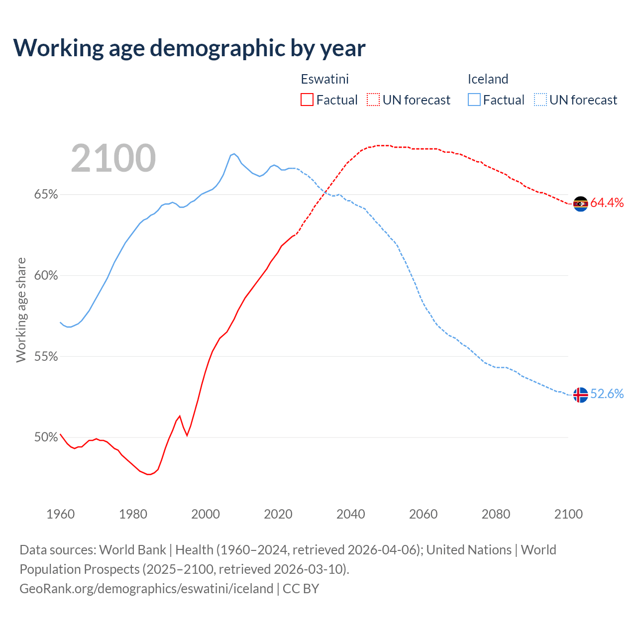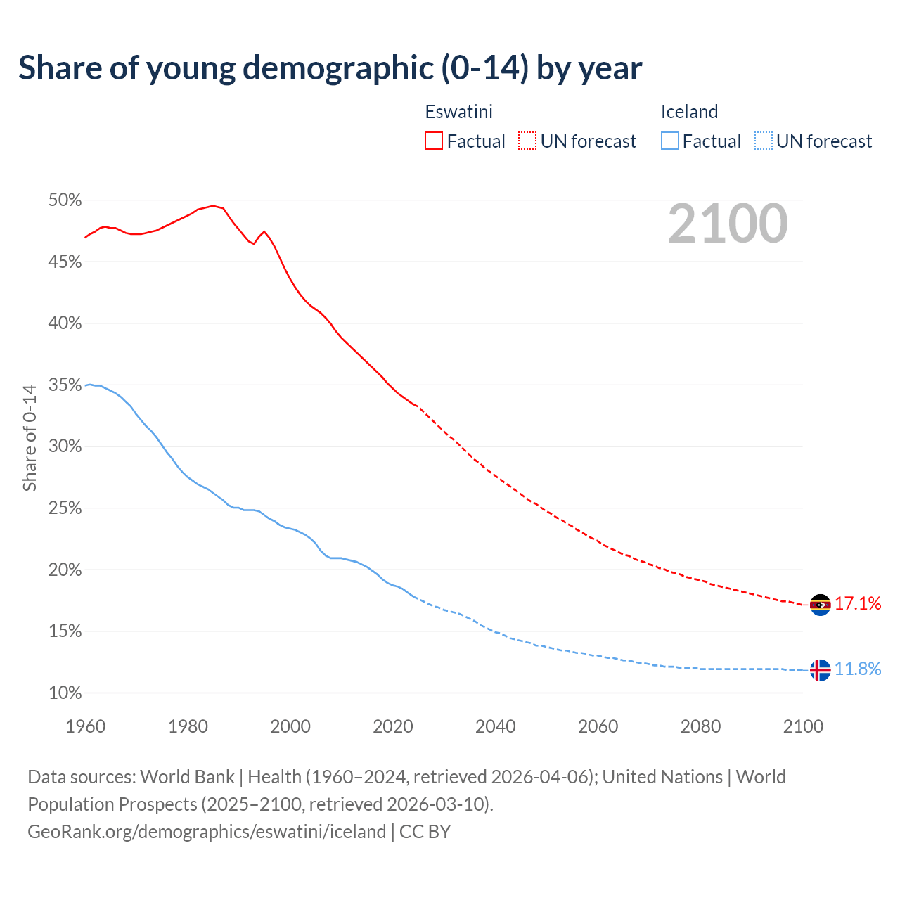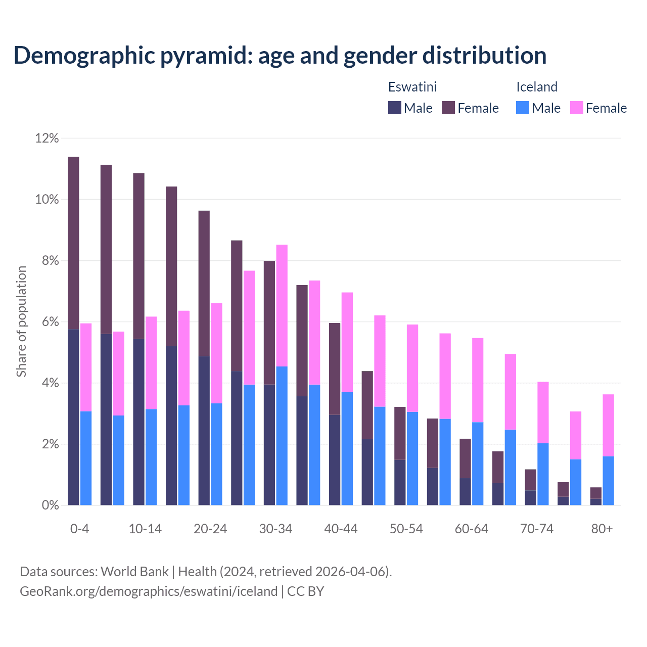 - The share of young demographic (0-15 years old) in Eswatini is 33.4% vs 17.8% in Iceland.