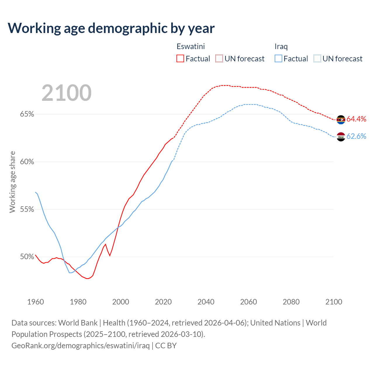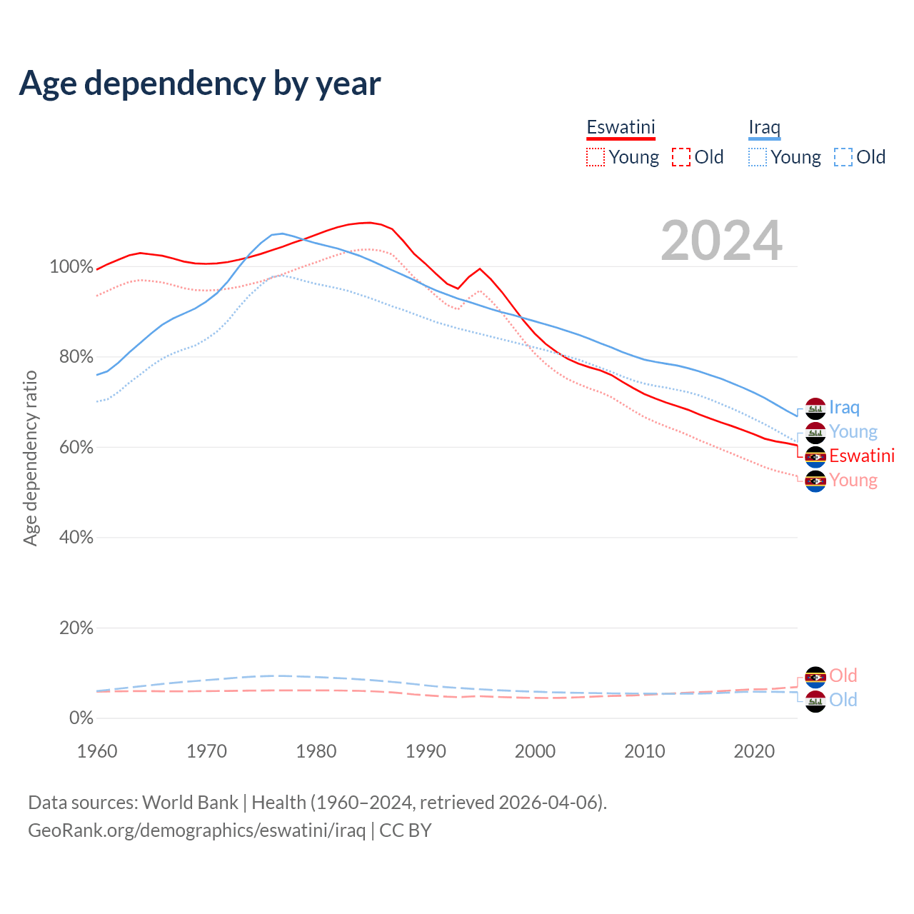 - The share of old-age demographic (65+) in Eswatini is 4.26% vs 3.41% in Iraq.