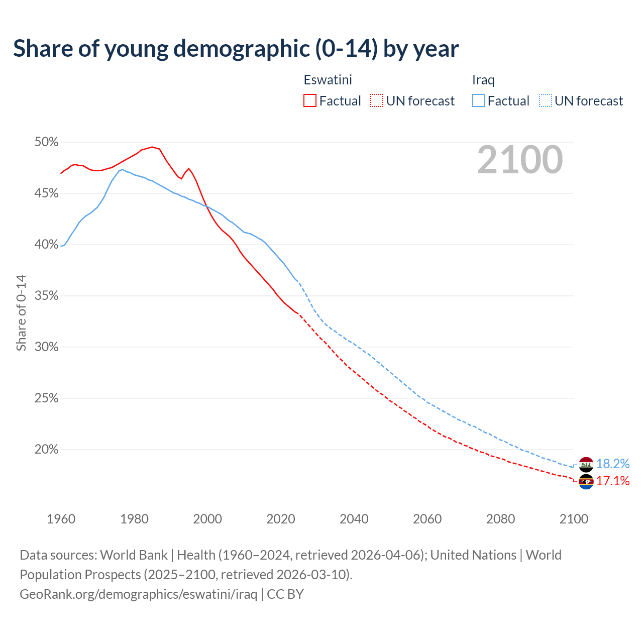 - The share of young demographic (0-15 years old) in Eswatini is 33.4% vs 36.6% in Iraq.