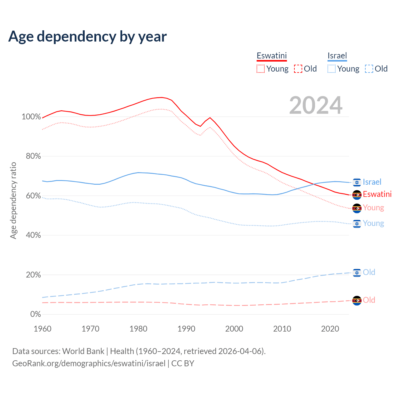 - The share of old-age demographic (65+) in Eswatini is 4.26% vs 12.6% in Israel.