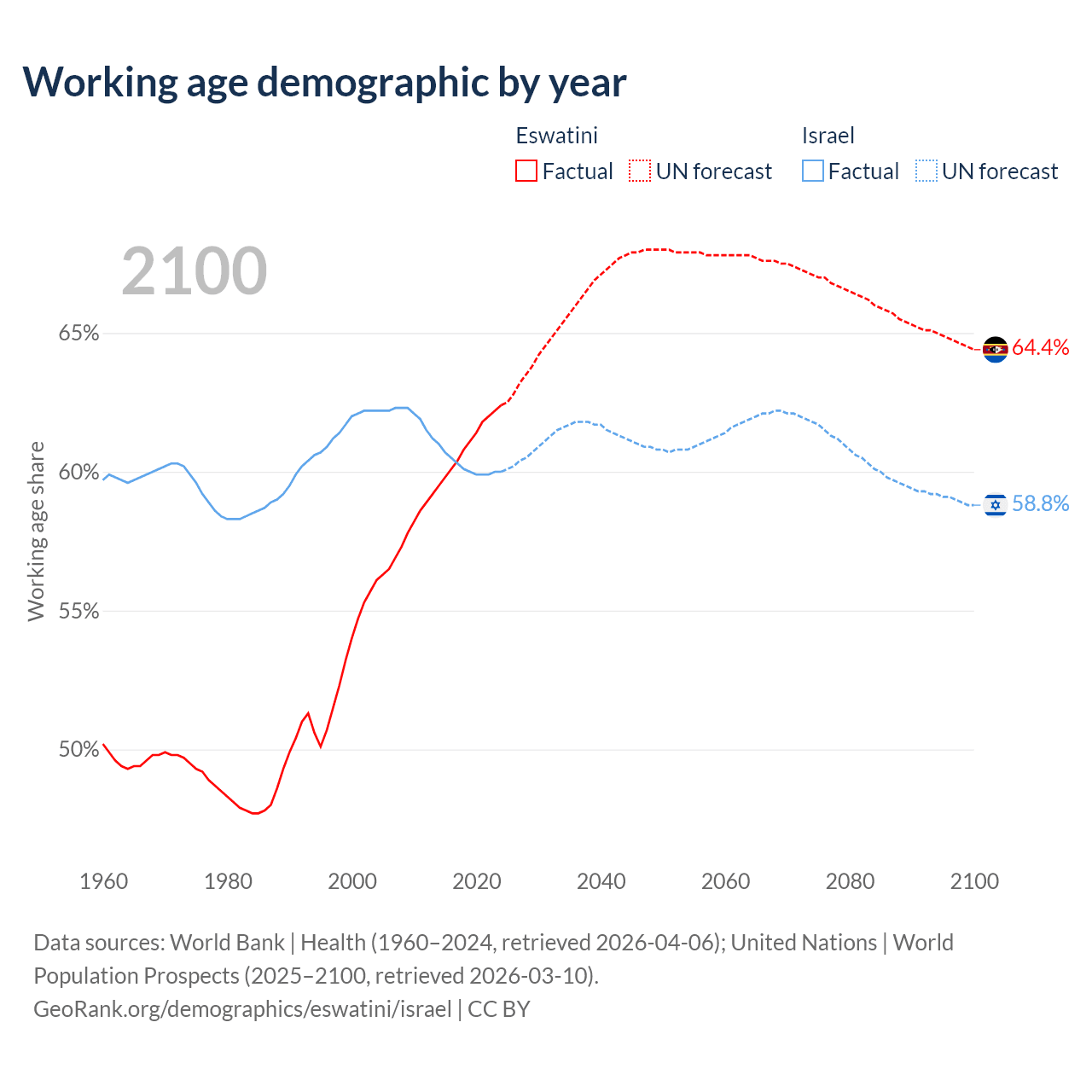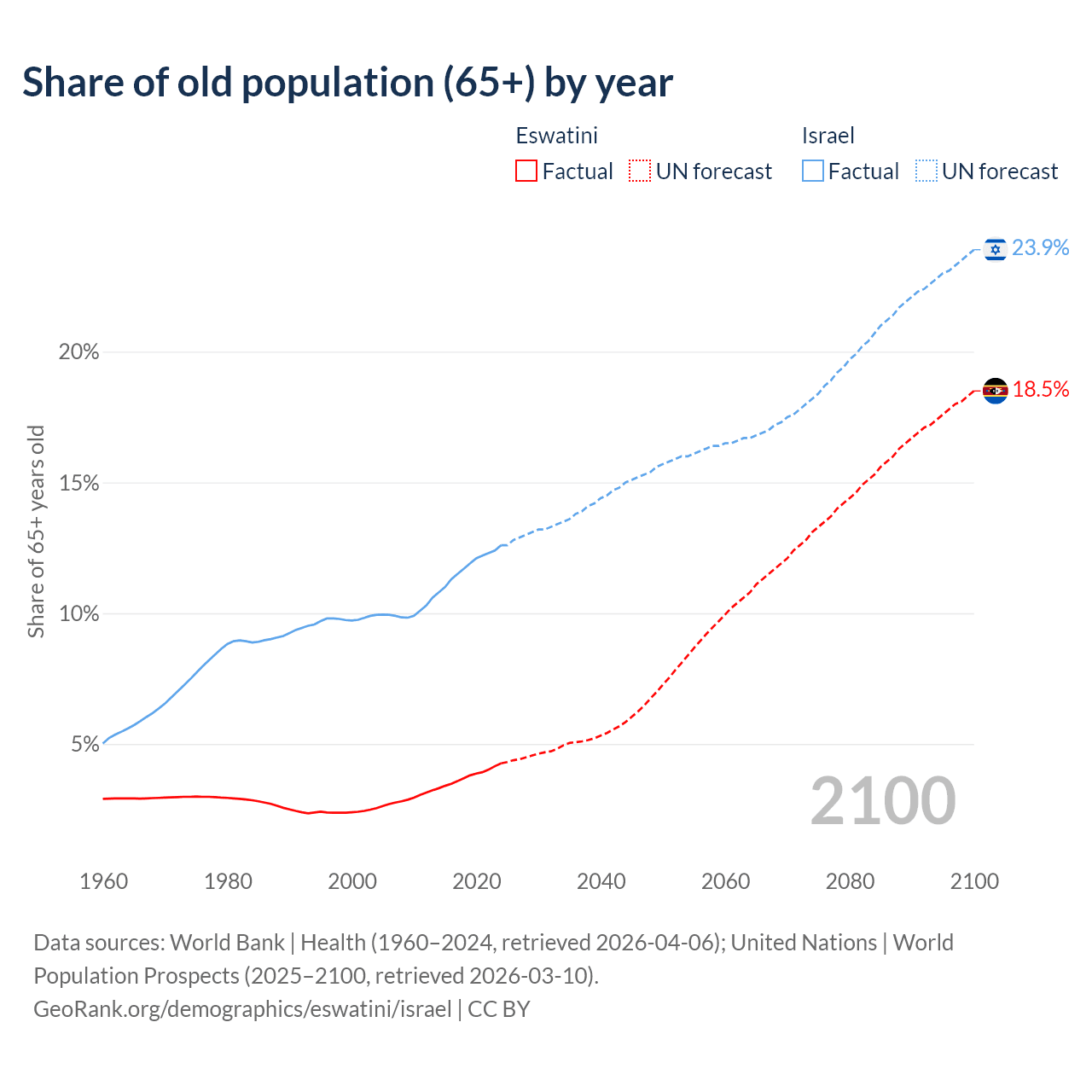 The share of older people aged 65 and over is 4.26% in Eswatini and 12.6% in Israel. Life expectancy in Eswatini compared to Israel .