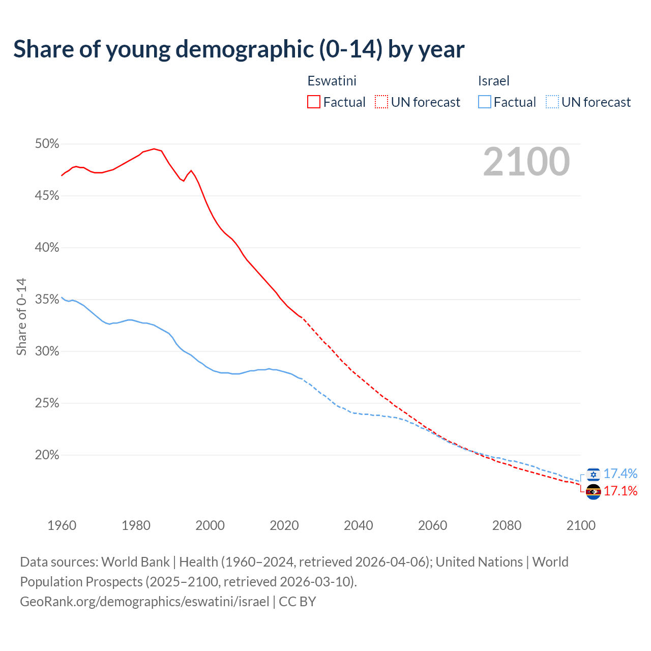 - The share of young demographic (0-15 years old) in Eswatini is 33.4% vs 27.4% in Israel.