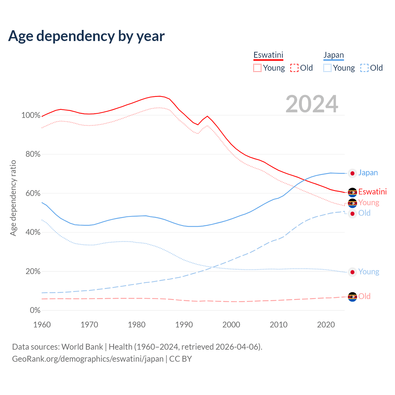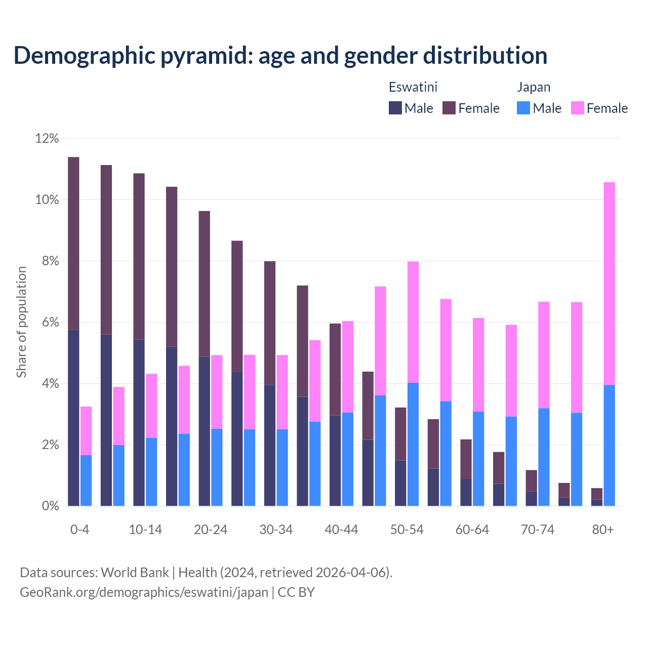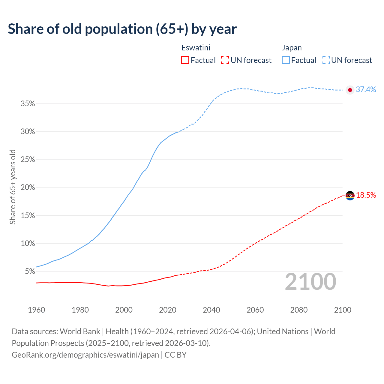 The share of older people aged 65 and over is 4.26% in Eswatini and 29.8% in Japan. Life expectancy in Eswatini compared to Japan .