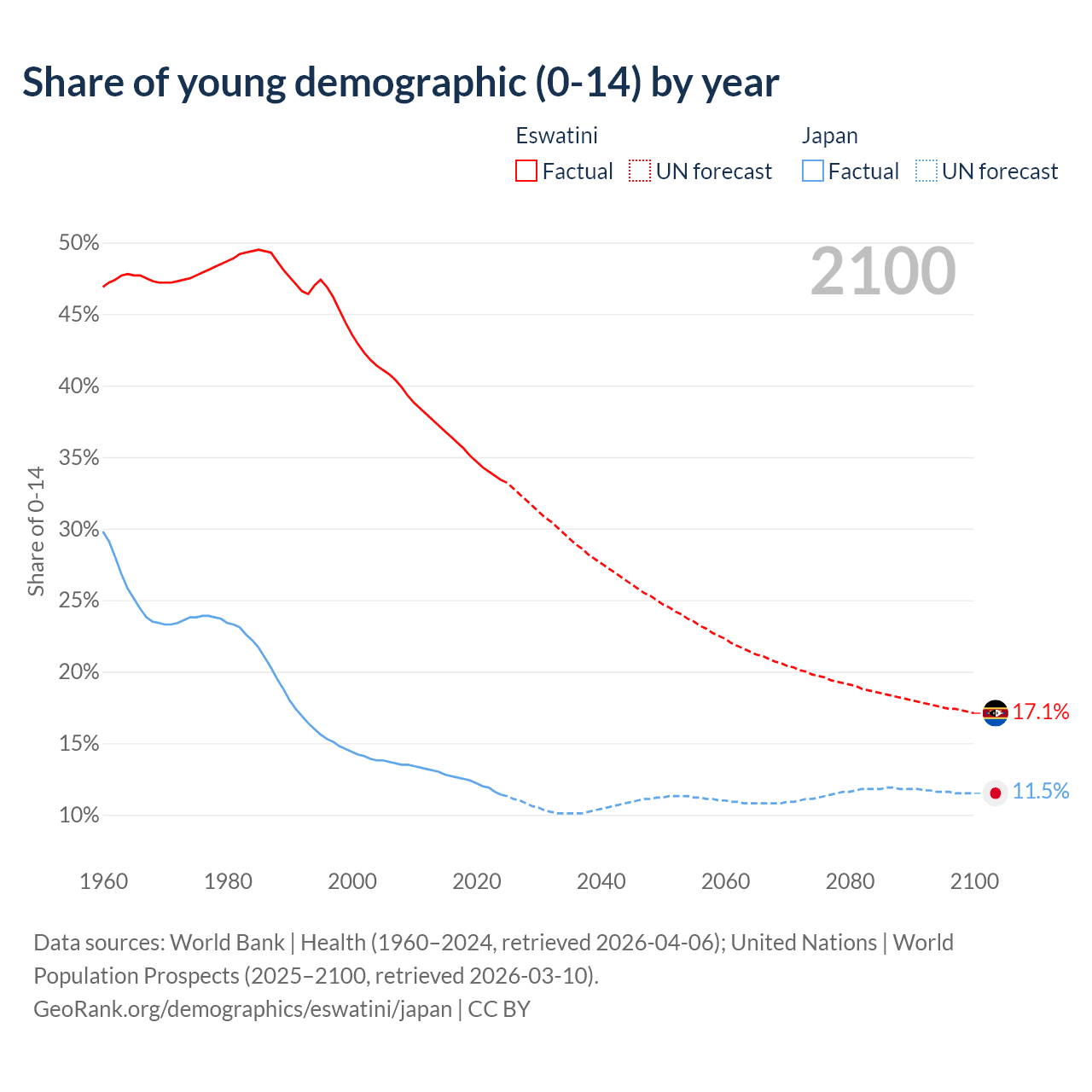 - The share of young demographic (0-15 years old) in Eswatini is 33.4% vs 11.4% in Japan.