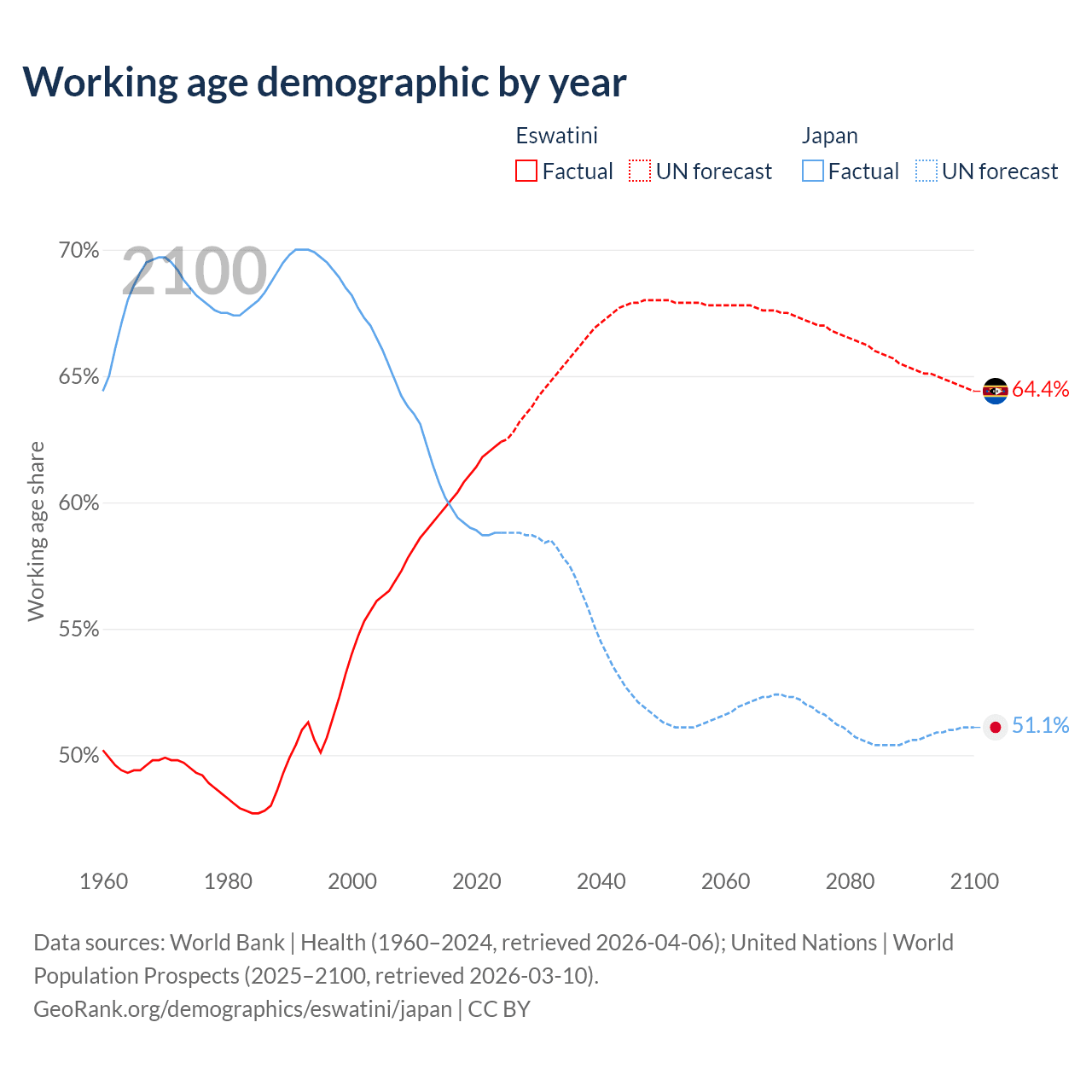 - Eswatini has 794K working age adults (aged 15-64) vs 72.1M in Japan.