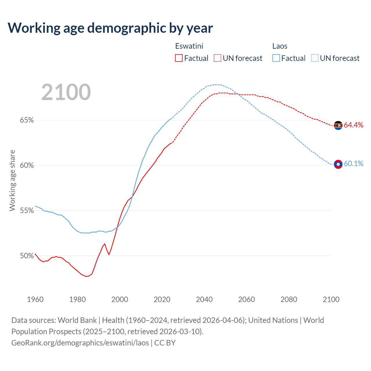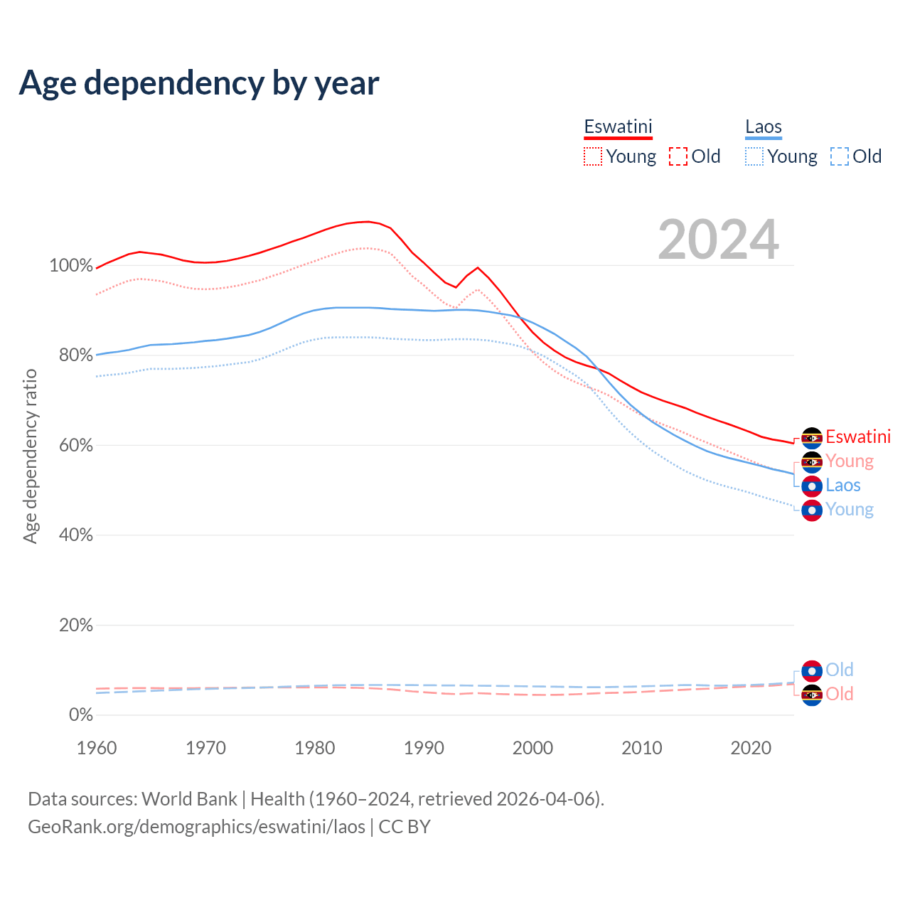 - The share of old-age demographic (65+) in Eswatini is 4.26% vs 4.67% in Laos.
