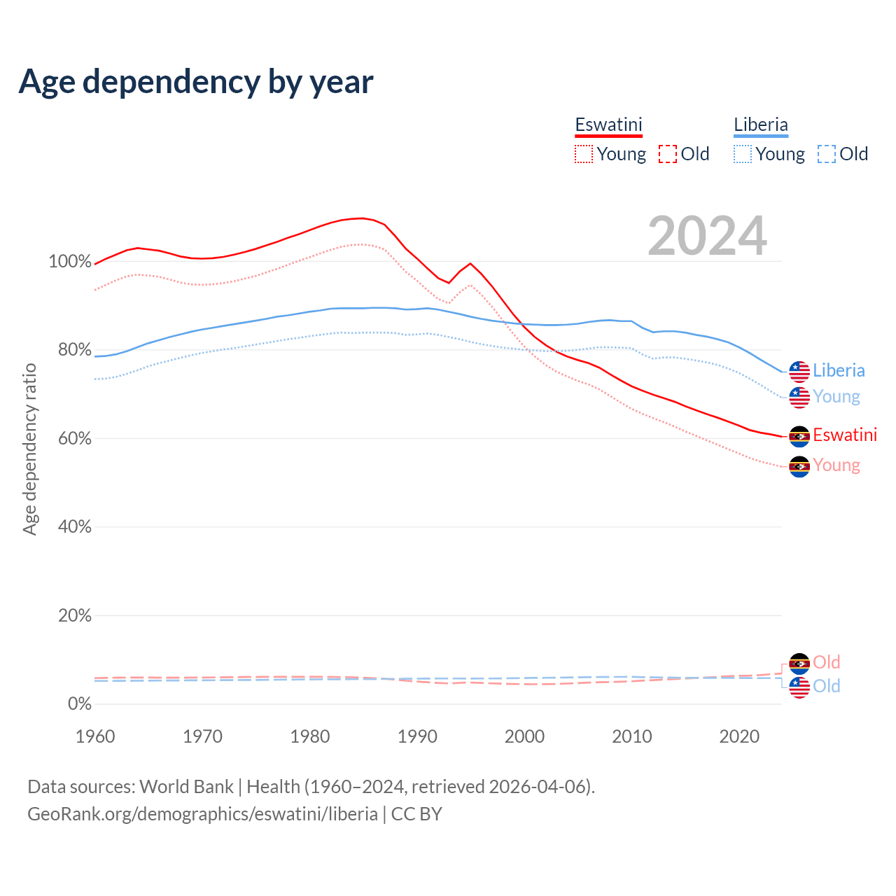 - The share of old-age demographic (65+) in Eswatini is 4.26% vs 3.3% in Liberia.
